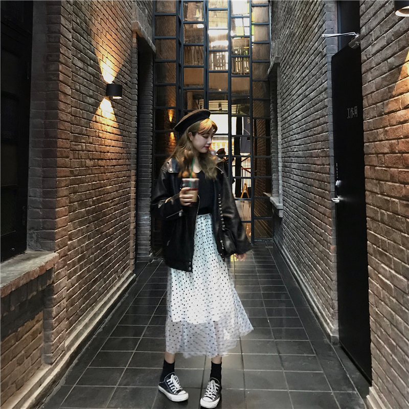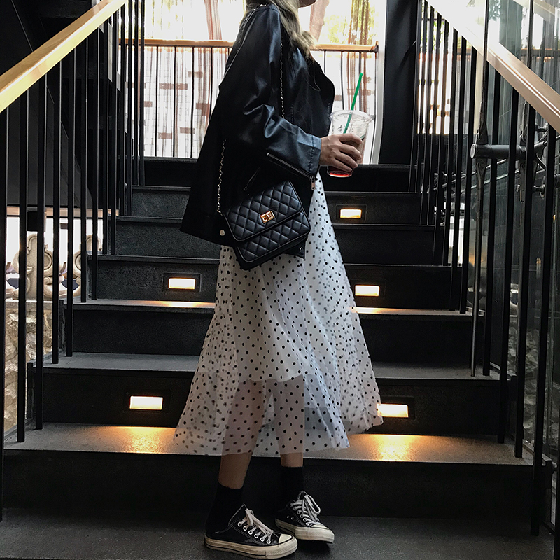 / 2018新款秋季女裝韓版chic波點網紗半身裙學生裙子高腰A字裙長裙