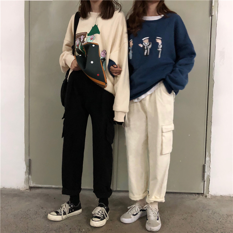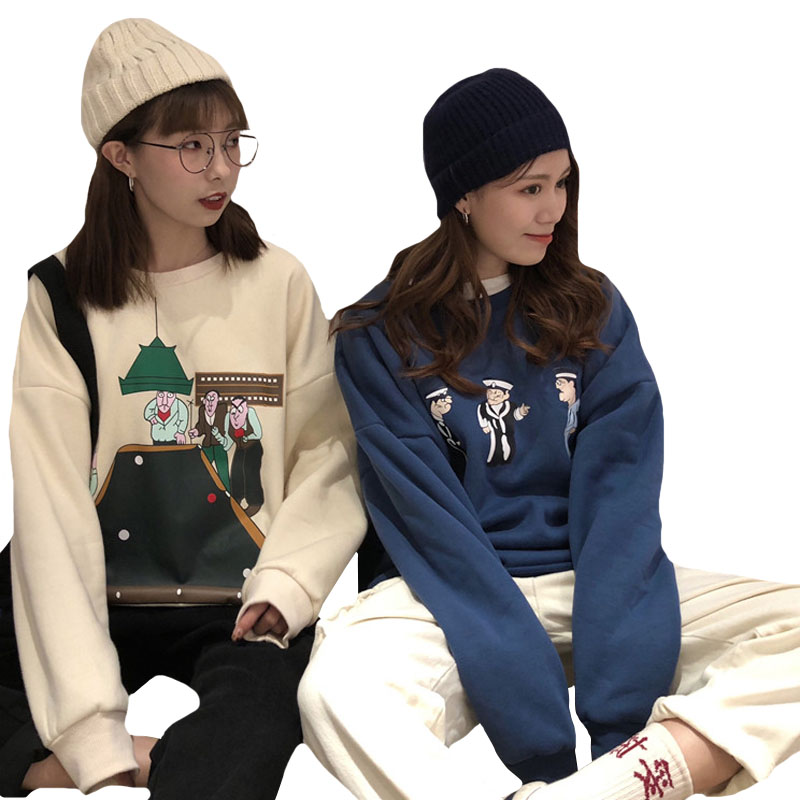 2018新款秋冬女裝韓版復古寬松卡通加絨加厚保暖套頭衛衣上衣外套