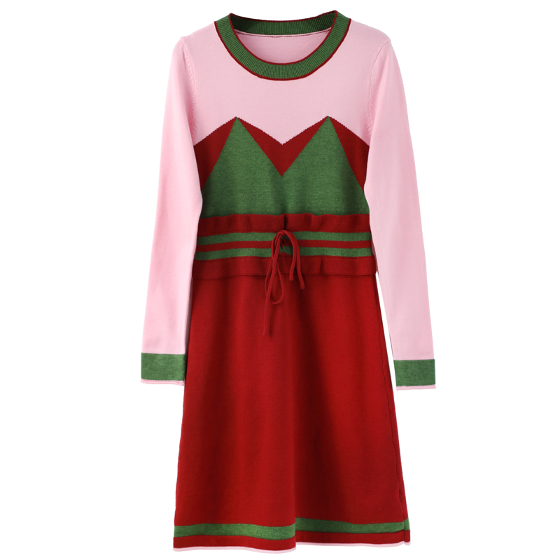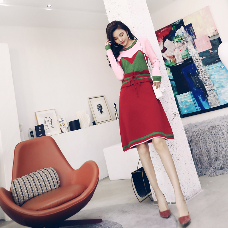 2018秋冬新款圓領時尚毛衣女針織衫拼色套頭修身韓版連衣裙中裙