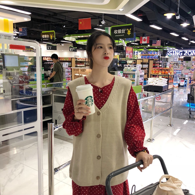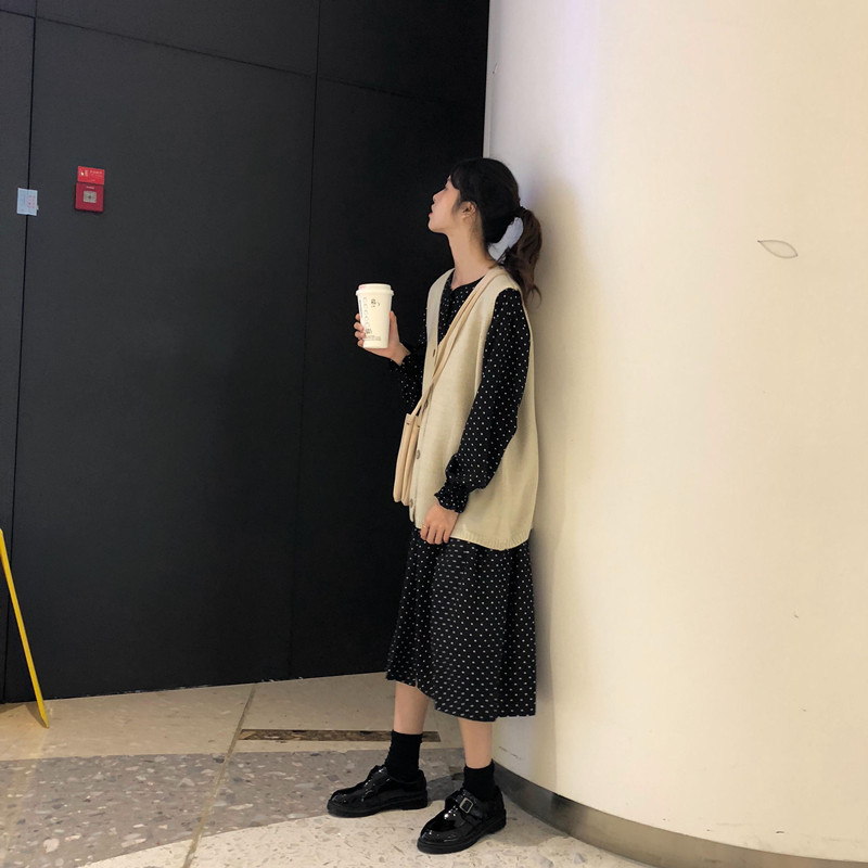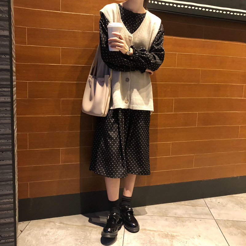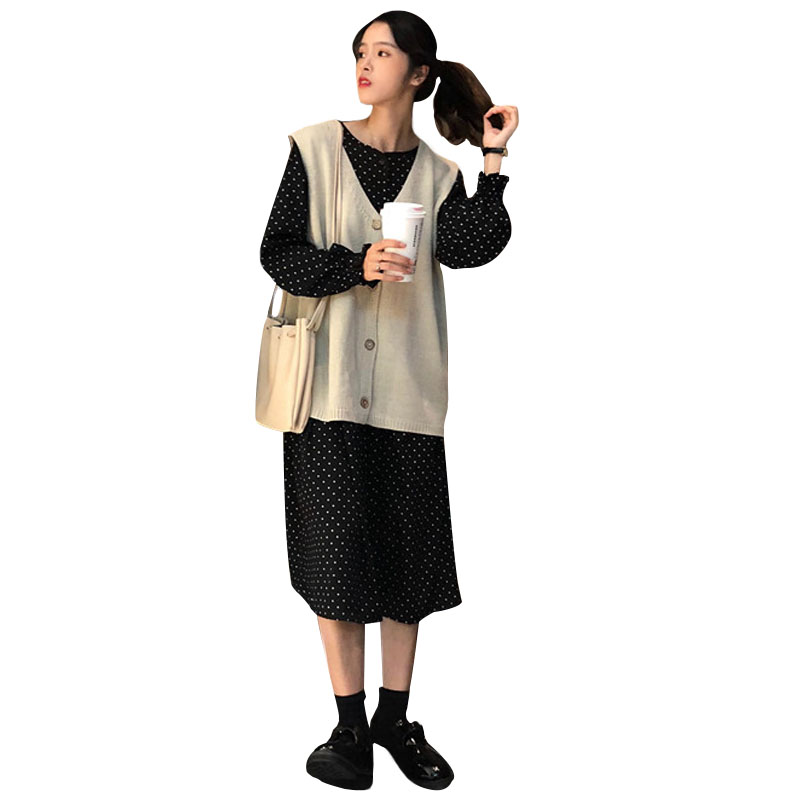 / 秋季韓版氣質中長款寬松圓點長袖襯衫連衣裙長裙+針織開衫馬甲女