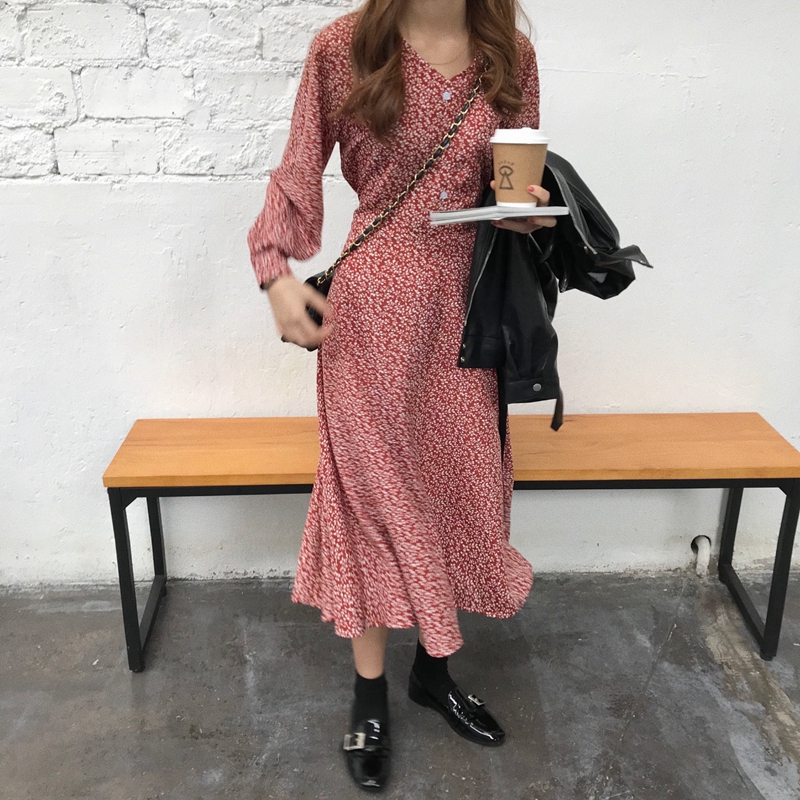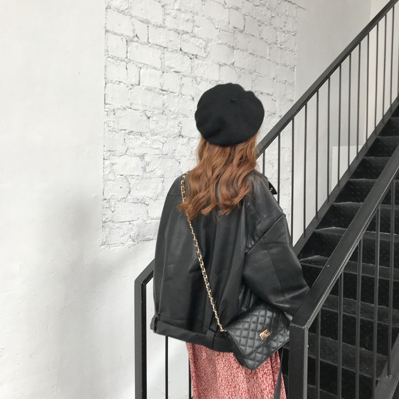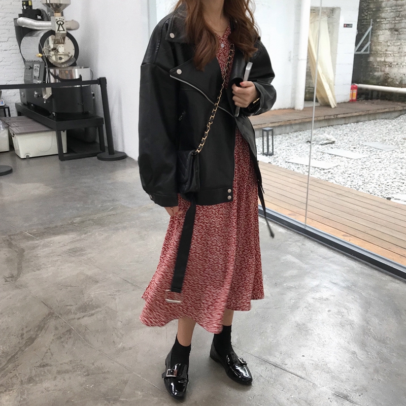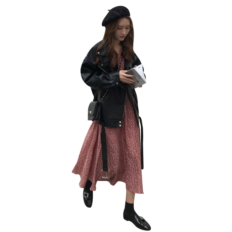 / 韓版時尚休閑套裝秋季女裝機車服皮衣外套+雪紡碎花連衣裙兩件套
