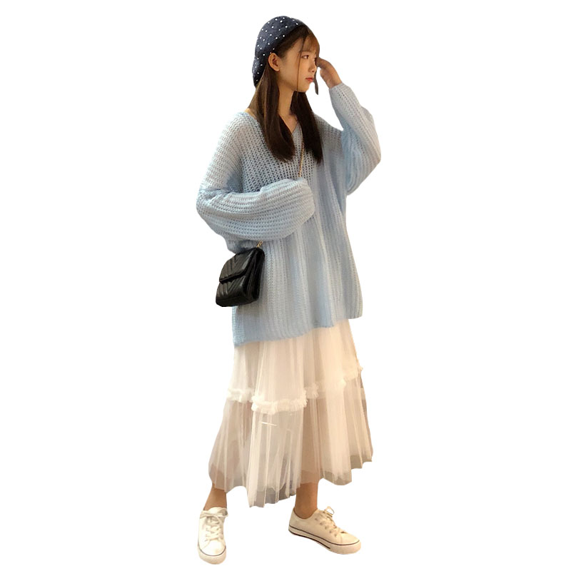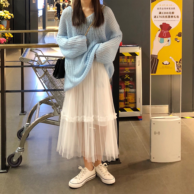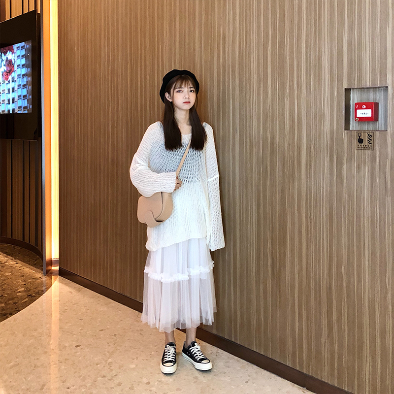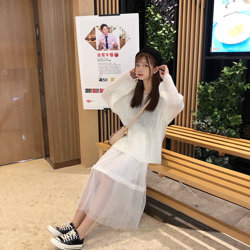 / 韓版時尚休閑套裝秋季網紅女裝chic慵懶風毛衣+網紗半身裙兩件套