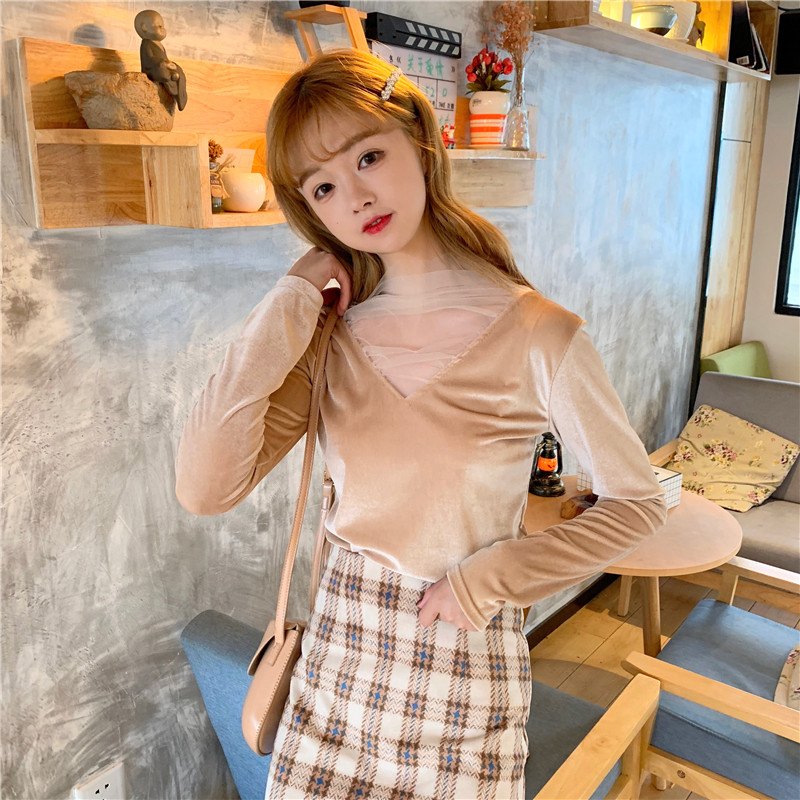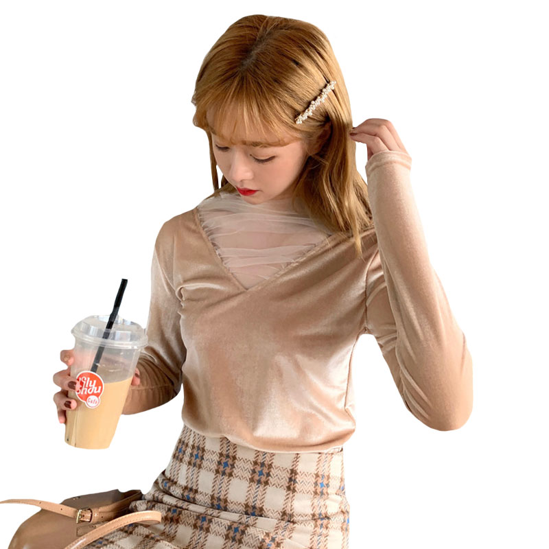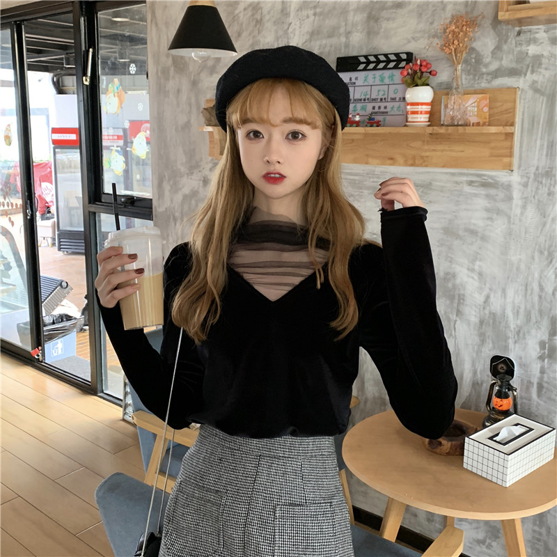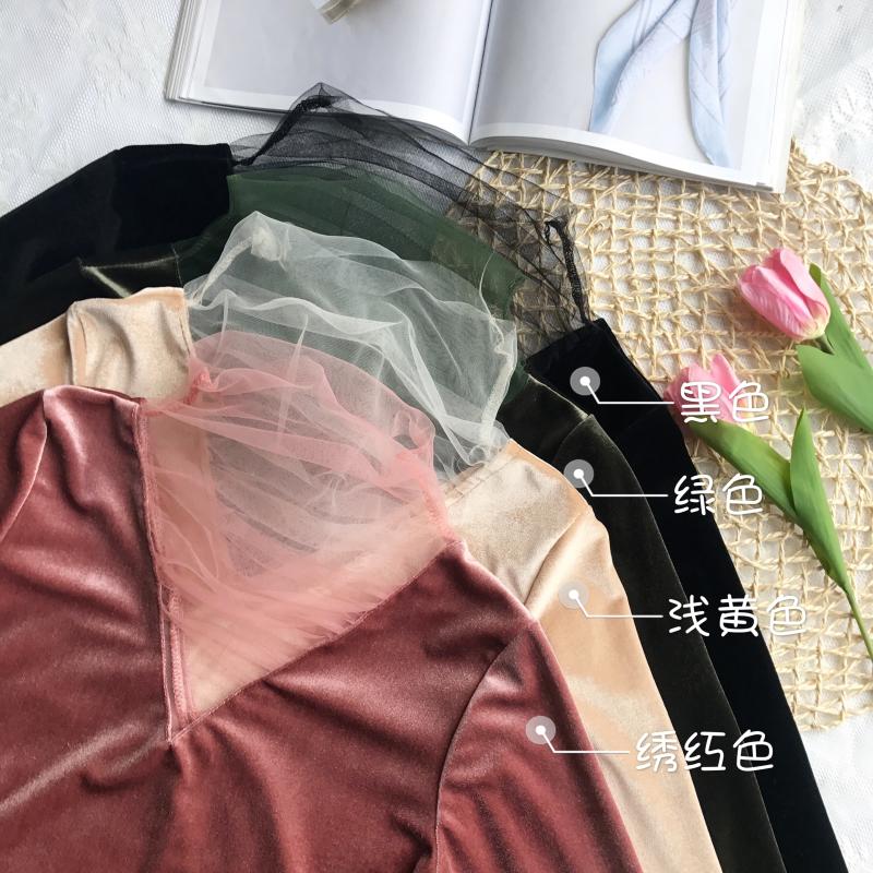 / 秋冬女裝韓版絲絨網紗拼接修身顯瘦百搭長袖打底衫T恤上衣學生潮