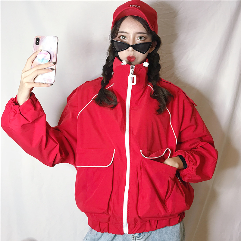 秋季女裝韓版BF風寬松純色百搭棒球服大口袋長袖夾克開衫上衣外套