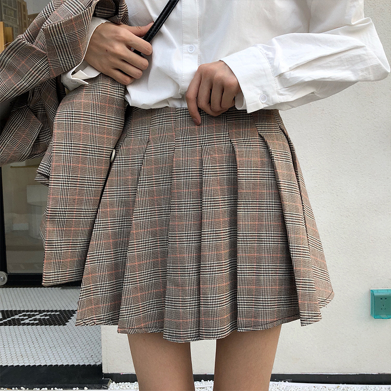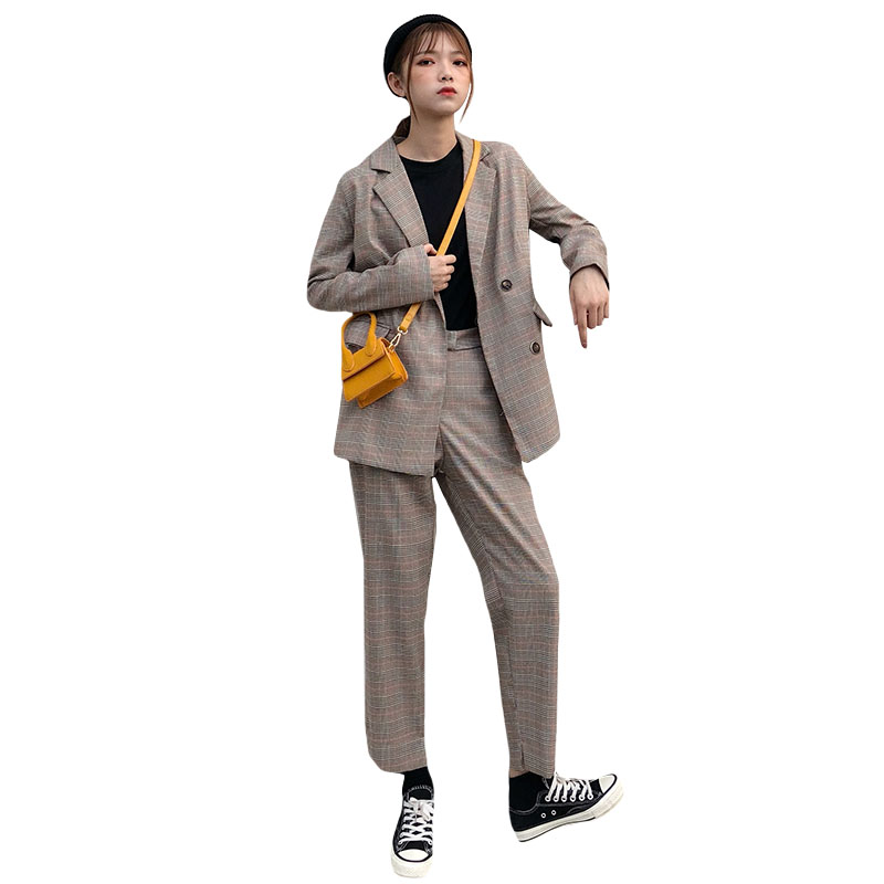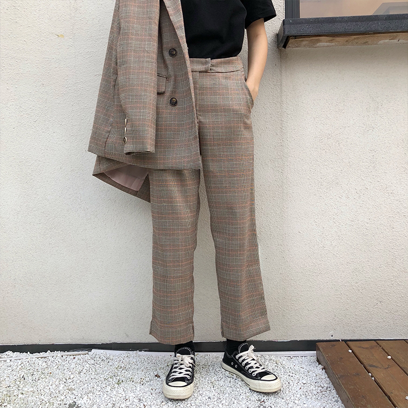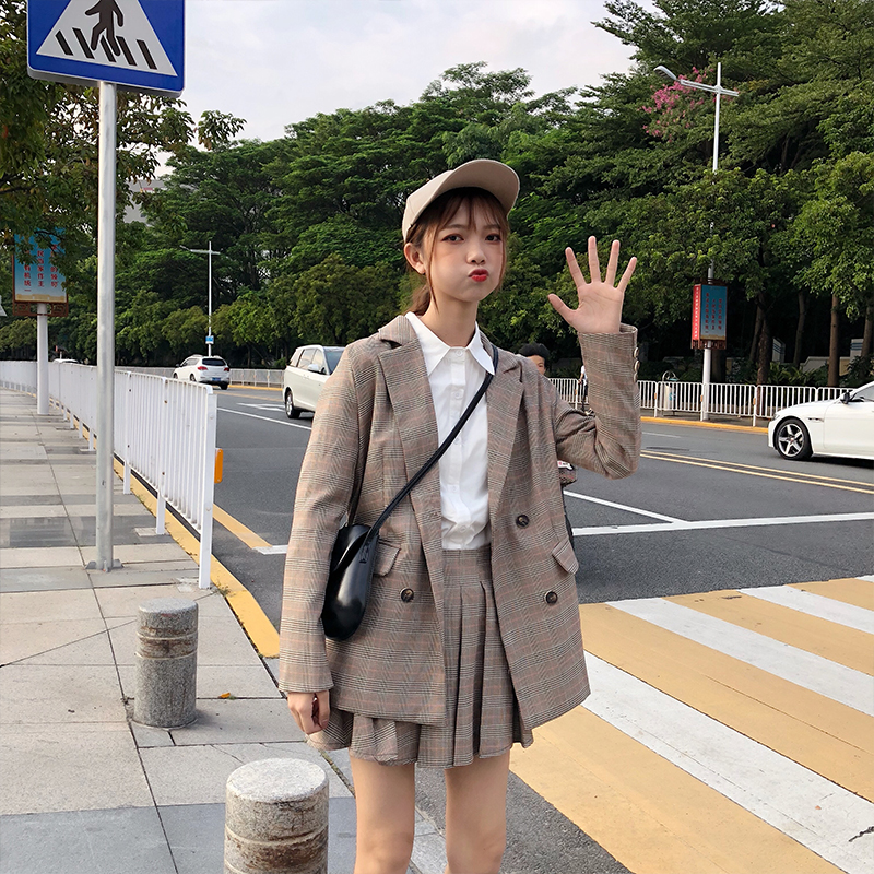 / 韓版時尚休閑套裝秋季女裝格子西裝外套+百褶裙+九分褲西褲三件套