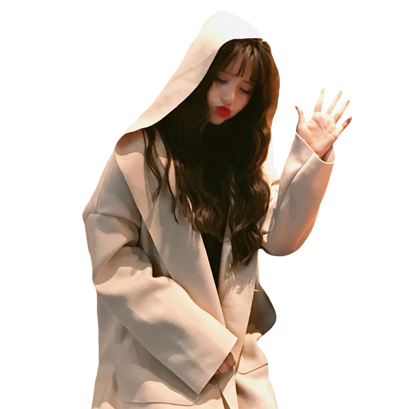秋冬女裝韓版純色寬松呢子大衣中長款連帽赫本風過膝風衣毛呢外套
