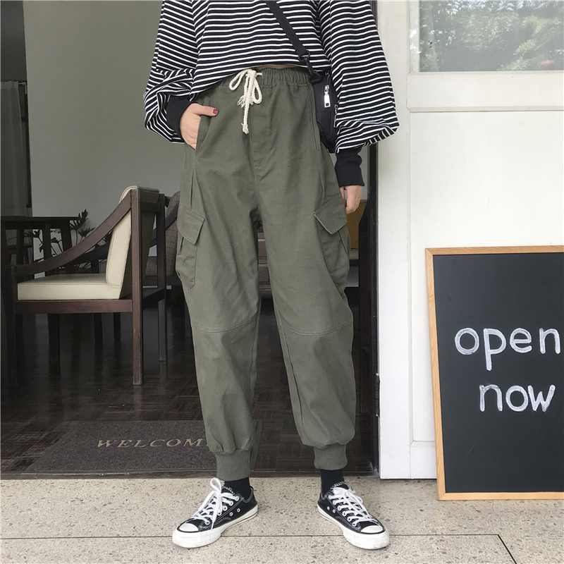 秋冬女裝韓版寬松高腰復古工裝束腳褲松緊腰休閑褲加厚哈倫褲長褲