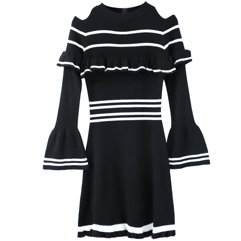 / 名媛氣質露肩長袖針織連衣裙早秋女裝2018新款中長款冬季打底裙子