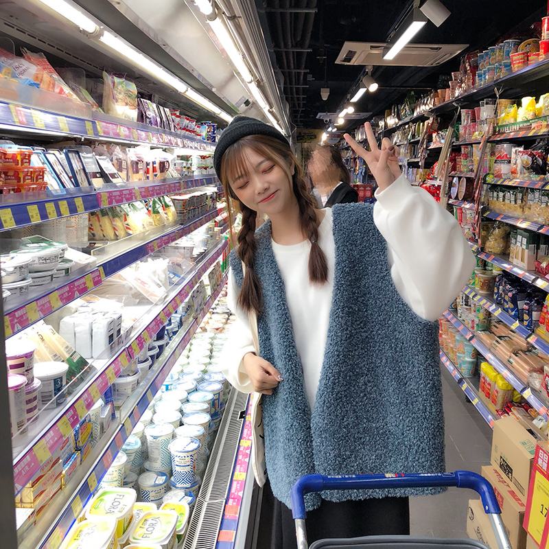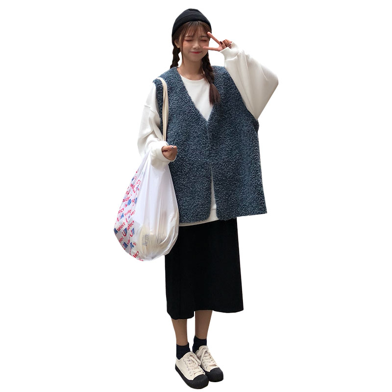 / 韓版時尚休閑套裝秋季女裝純色衛衣+羊羔毛馬甲+開叉半身裙三件套