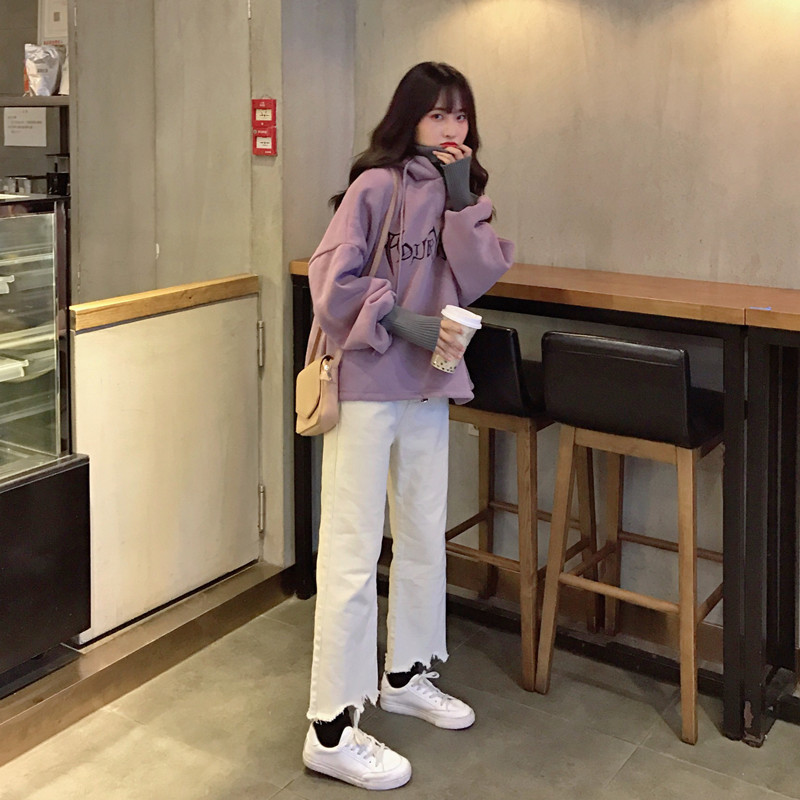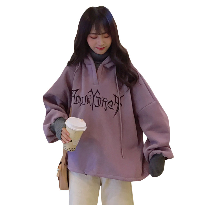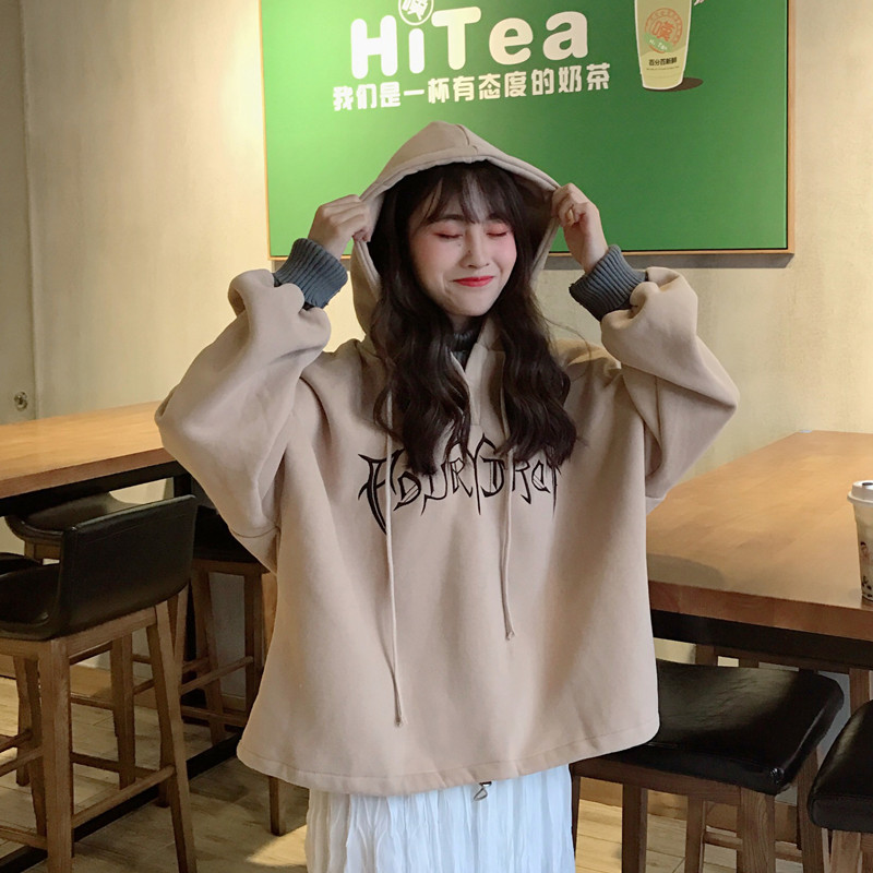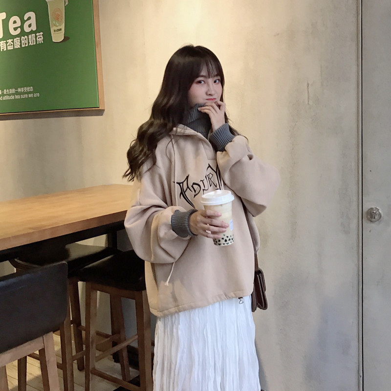 秋冬韓版原宿風高領拼接連帽字母刺繡寬松加絨加厚超火衛衣外套女
