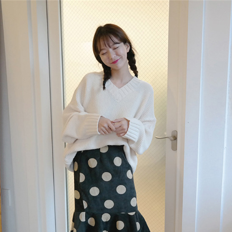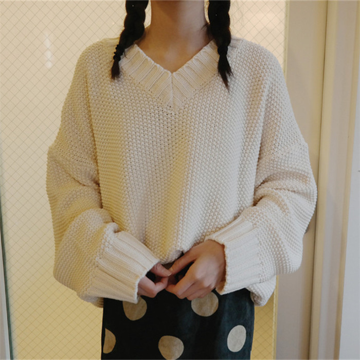 / 秋季女裝韓版學院風V領套頭毛衣寬松純色復古加厚長袖針織衫上衣