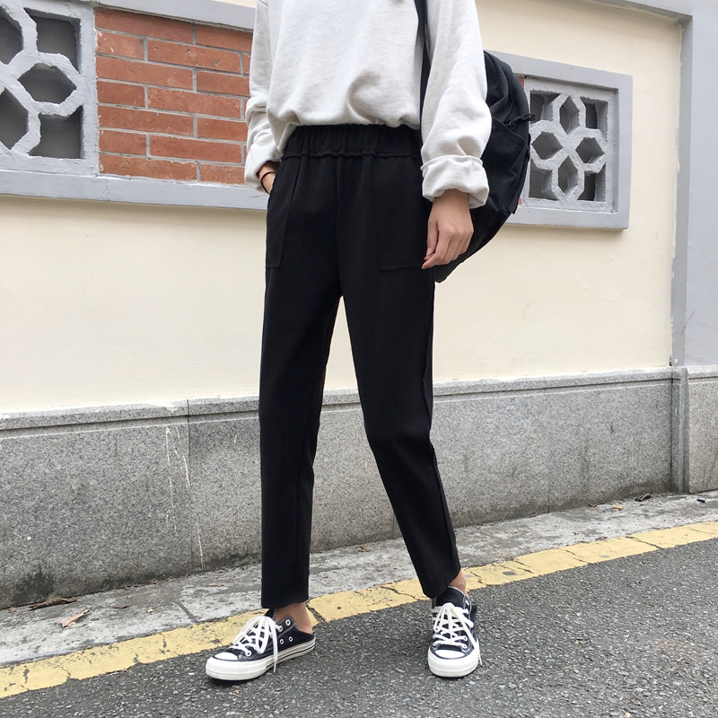 / 秋季韓版松緊腰寬松呢子哈倫褲高腰休閑褲直筒褲九分褲學生褲子女