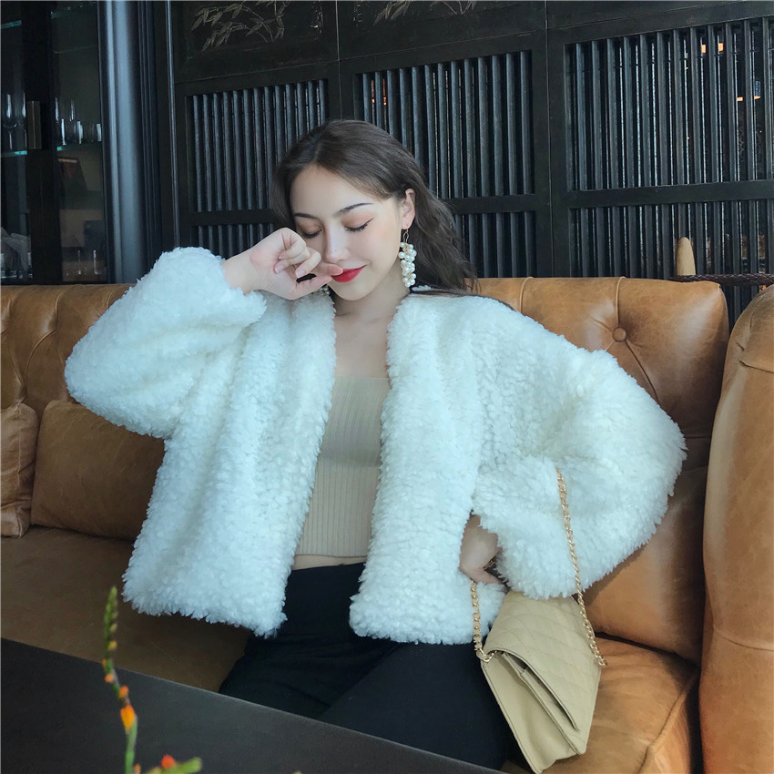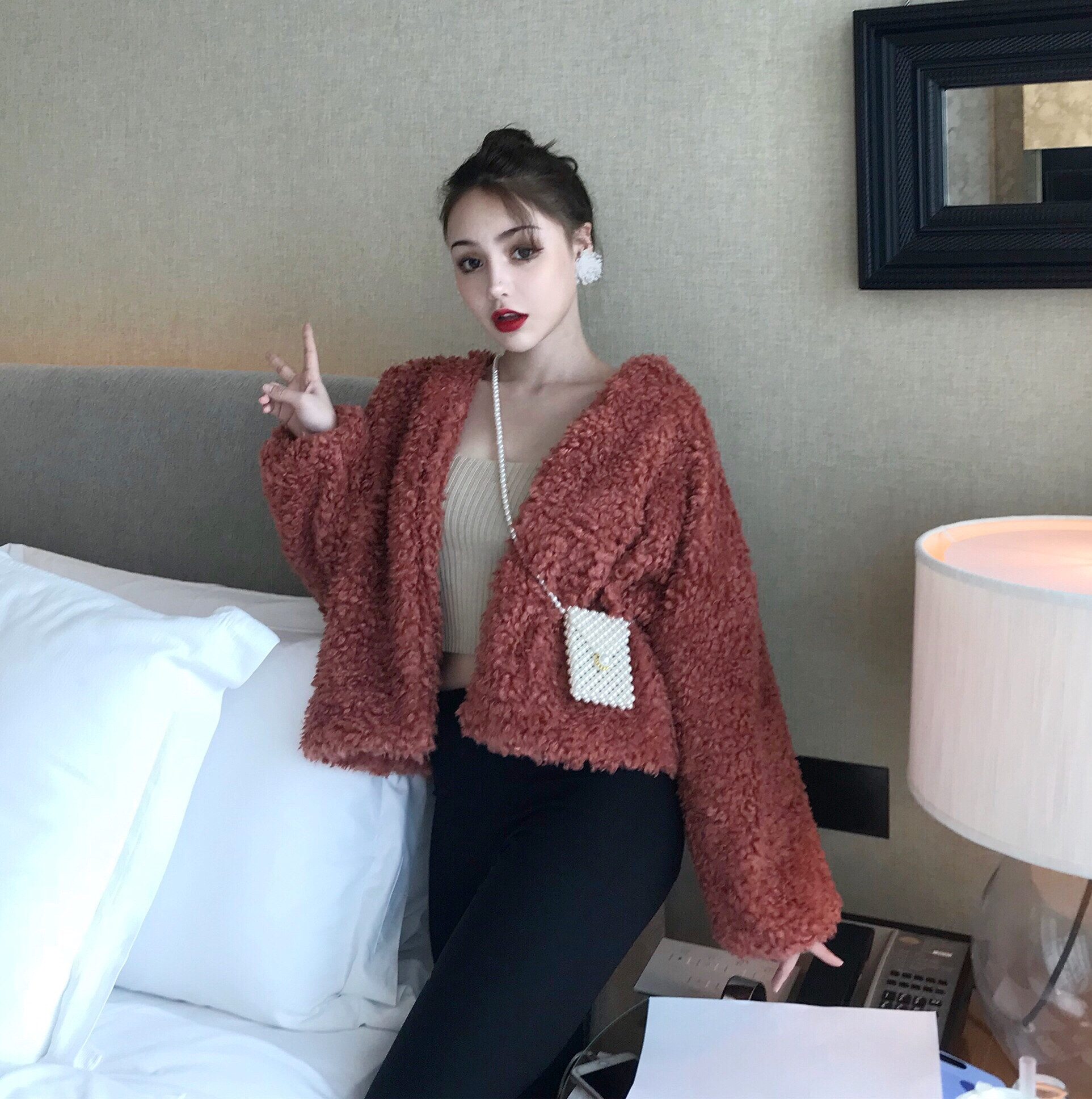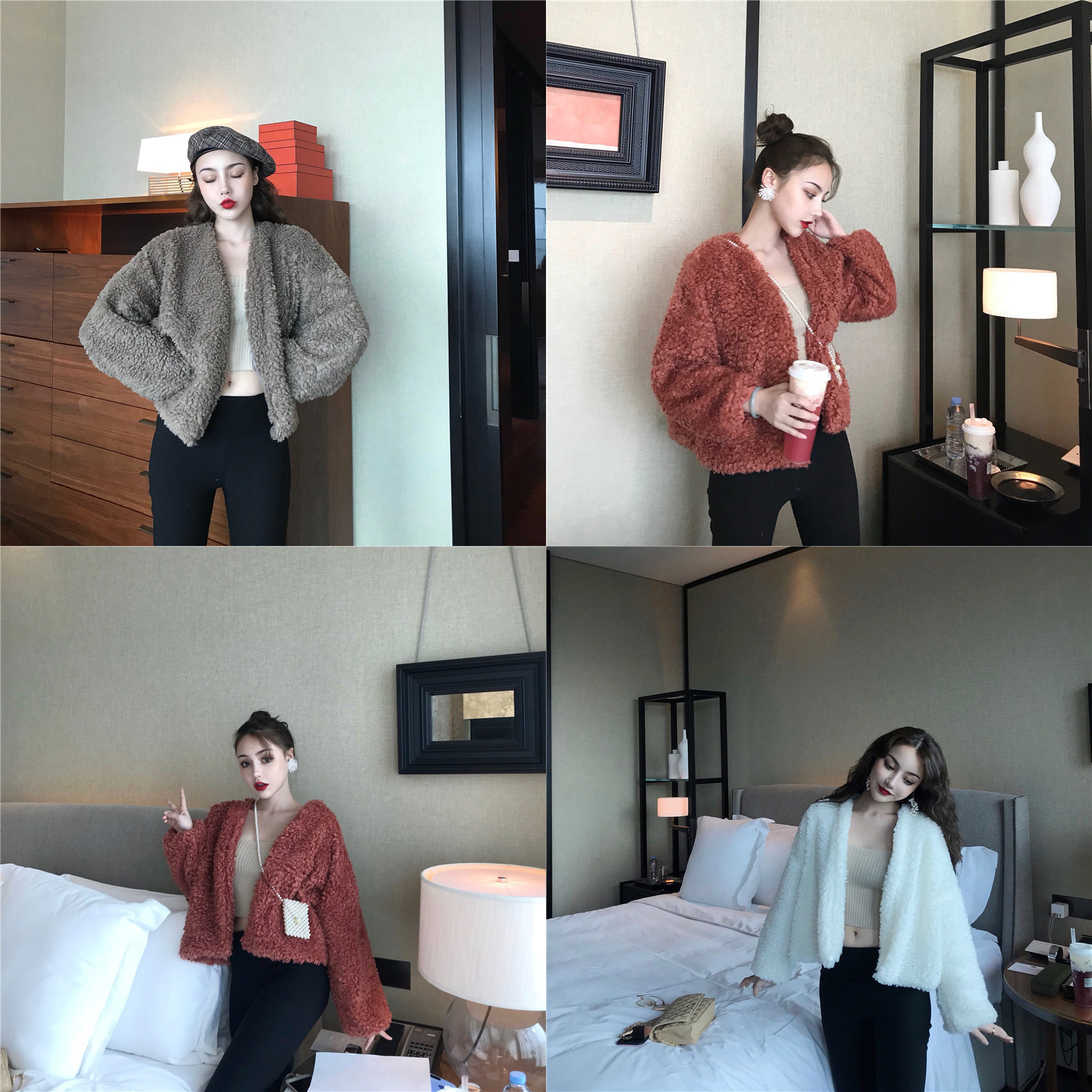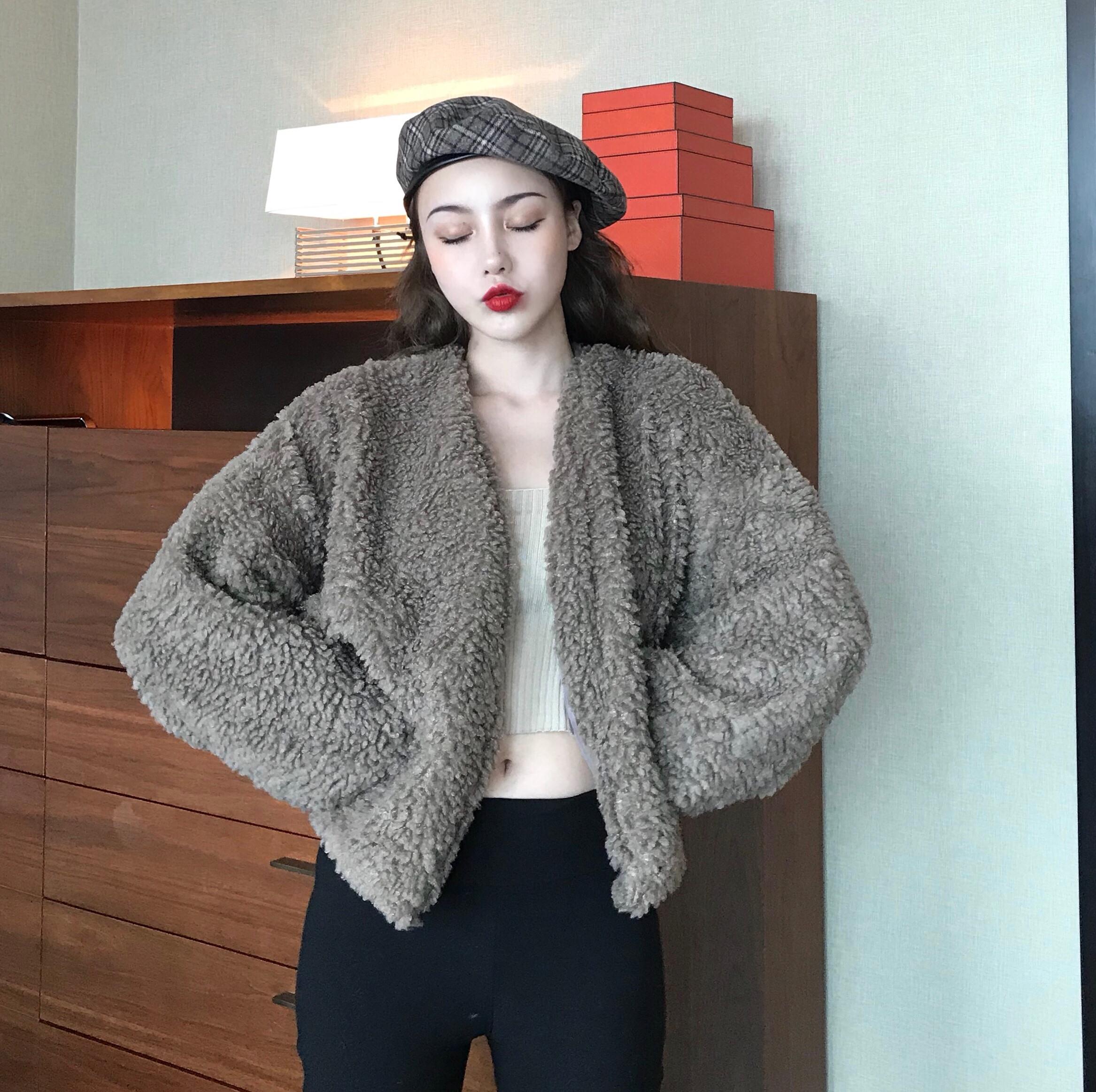 秋冬港風慵懶加絨加厚時尚chic毛毛羊羔毛保暖寬松開衫短款外套女