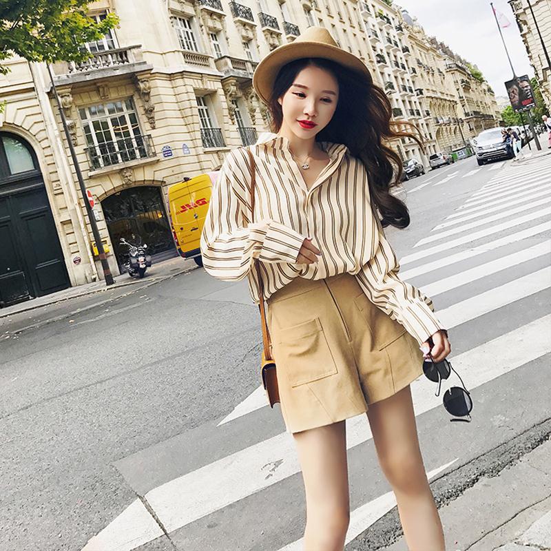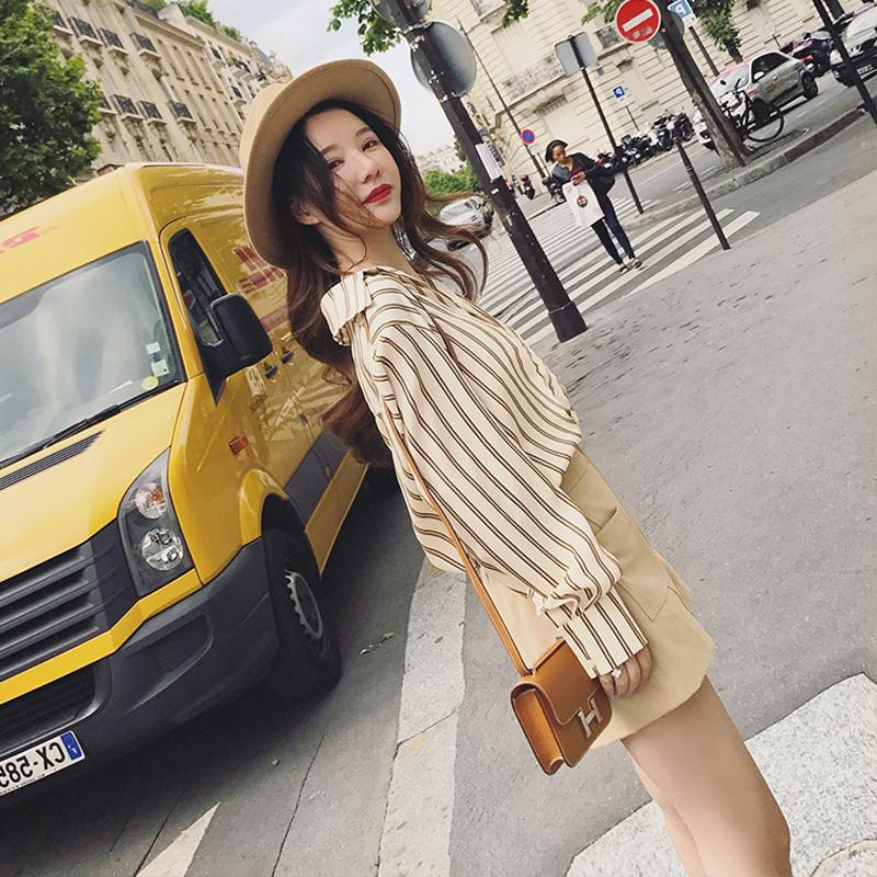 / 晚晚風秋裝矮個子網紅小清新chic洋氣條紋襯衫配闊腿褲兩件套裝女