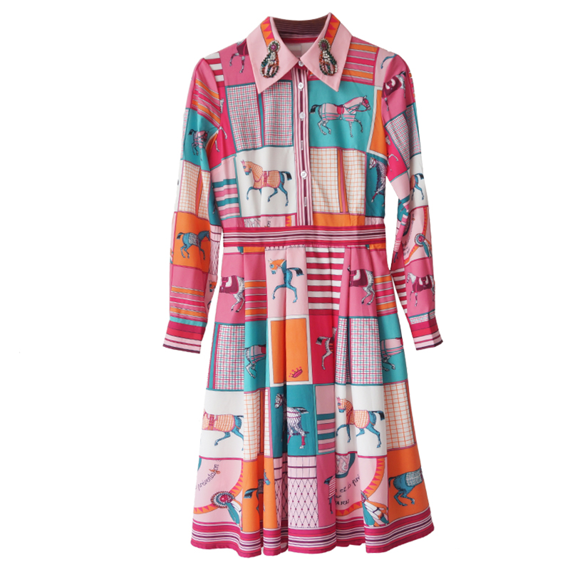 名媛清爽夏季新款2018歐美女裝翻領長袖襯衫復古印花中長款連衣裙