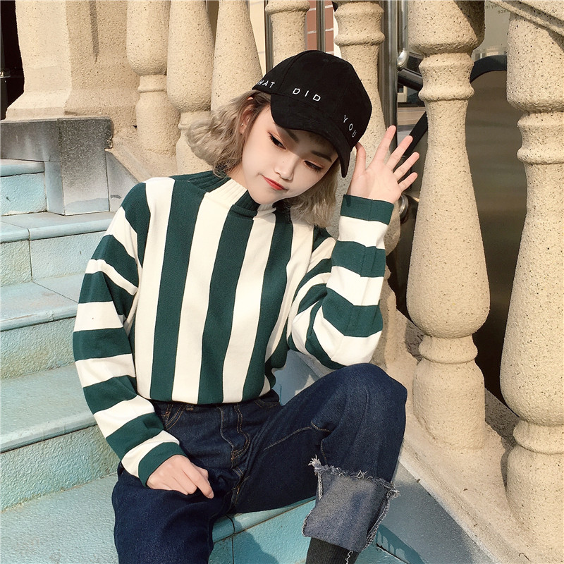 / 秋冬韓版學院風寬松豎條紋高領長袖網紅套頭針織衫毛衣上衣外套女