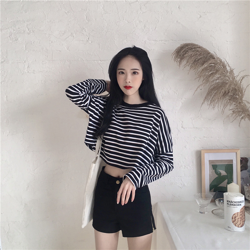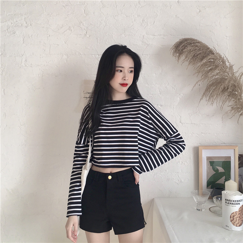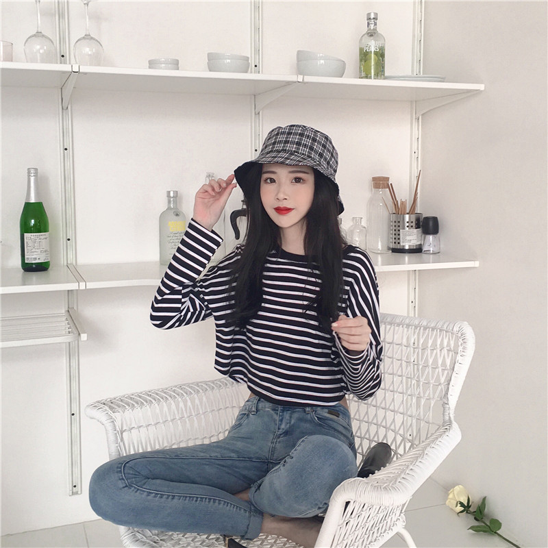 / 秋裝女裝韓版寬松百搭條紋短款長袖T恤學生露臍上衣打底衫體恤潮
