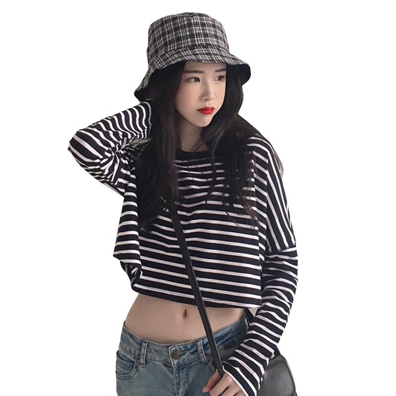秋裝女裝韓版寬松百搭條紋短款長袖T恤學生露臍上衣打底衫體恤潮