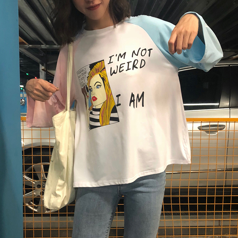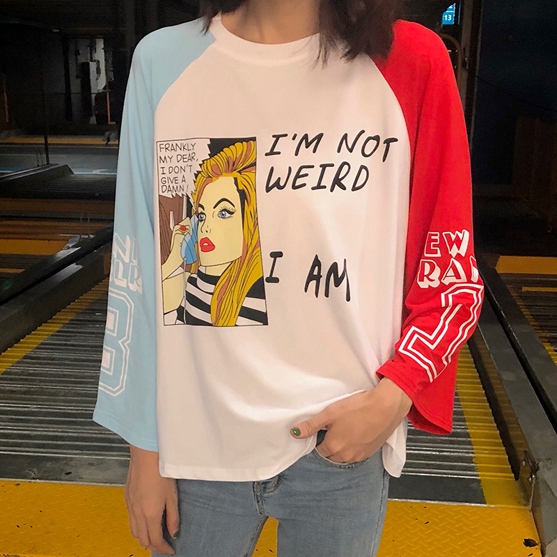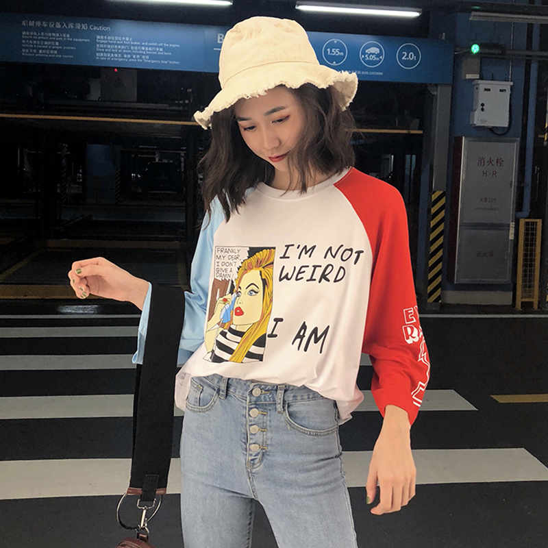 / 新款秋裝韓版學生寬松個性撞色圓領長袖t恤怪味少女印花潮流上衣
