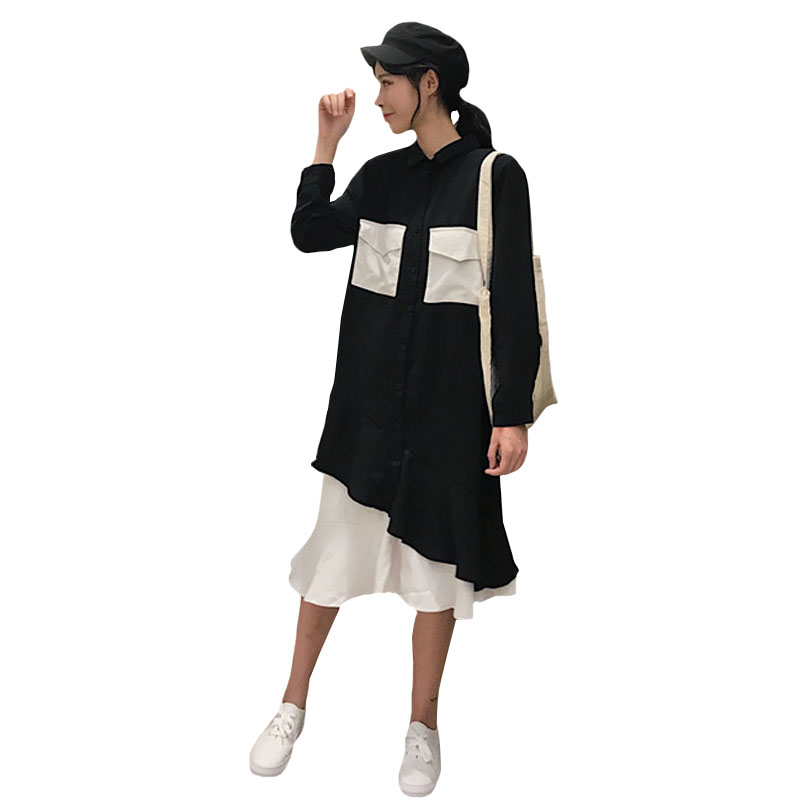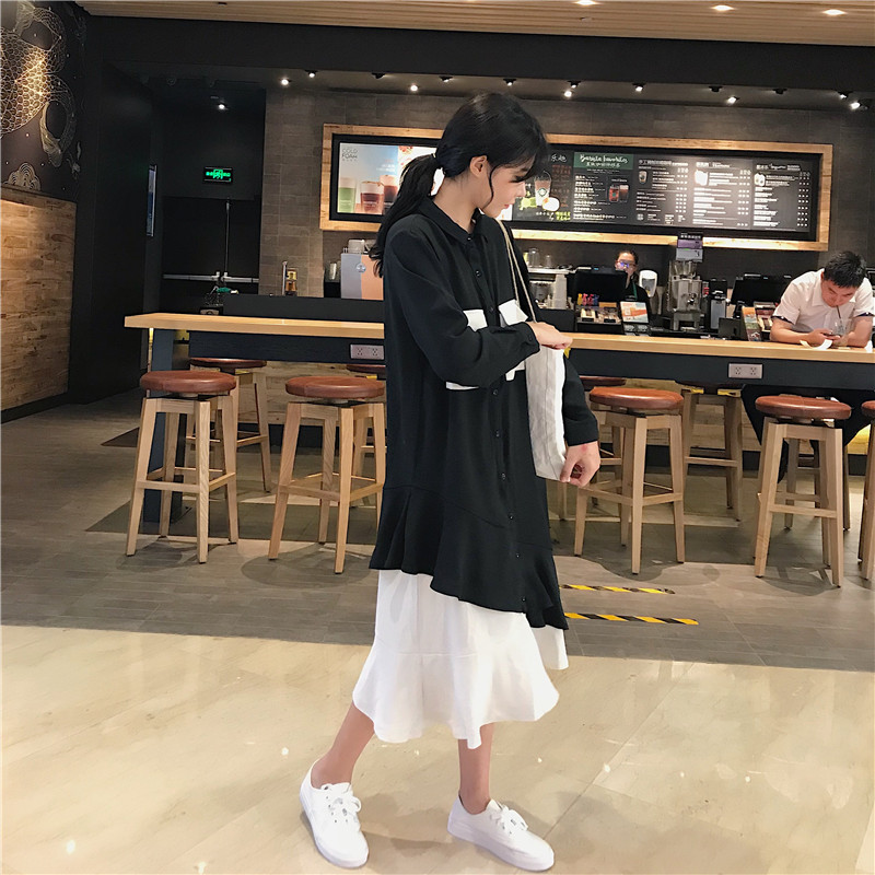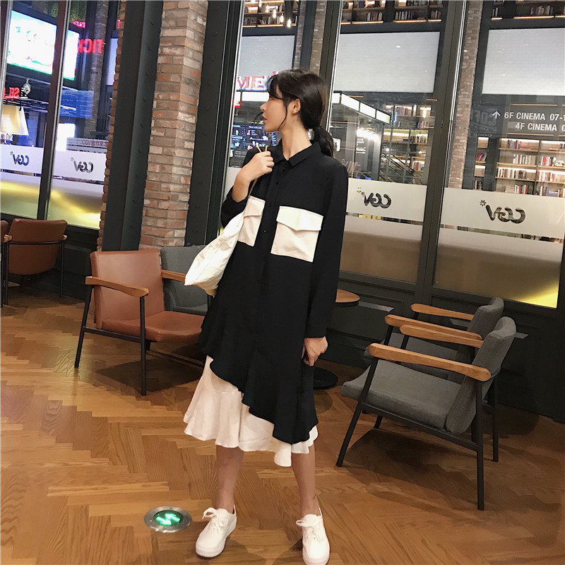 / 秋季2018新款韓版chic復古中長款拼接魚尾襯衫裙寬松連衣裙長裙女