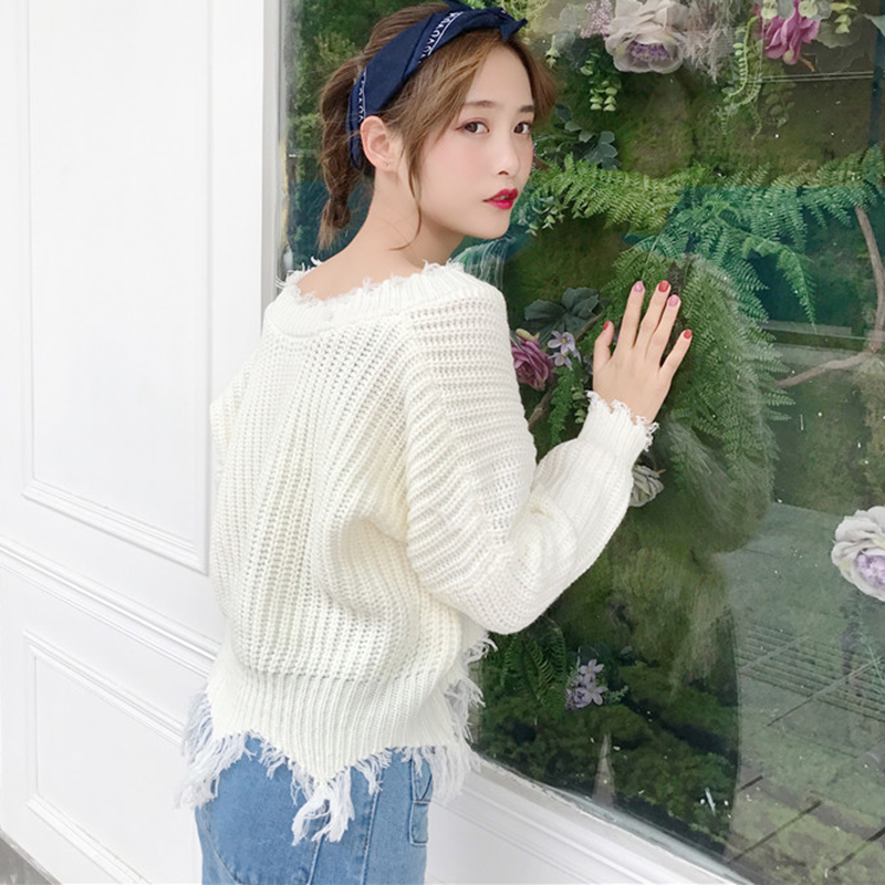 2018初秋新款女裝寬松套頭慵懶V領百搭流蘇長袖針織衫短毛衣上衣