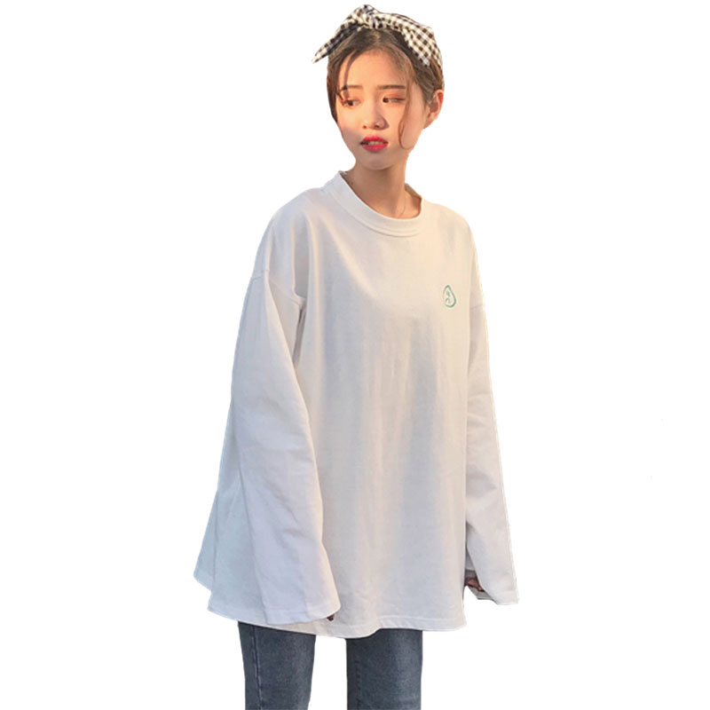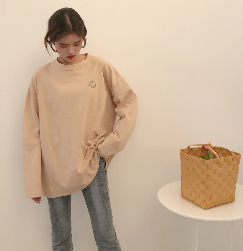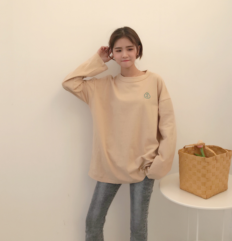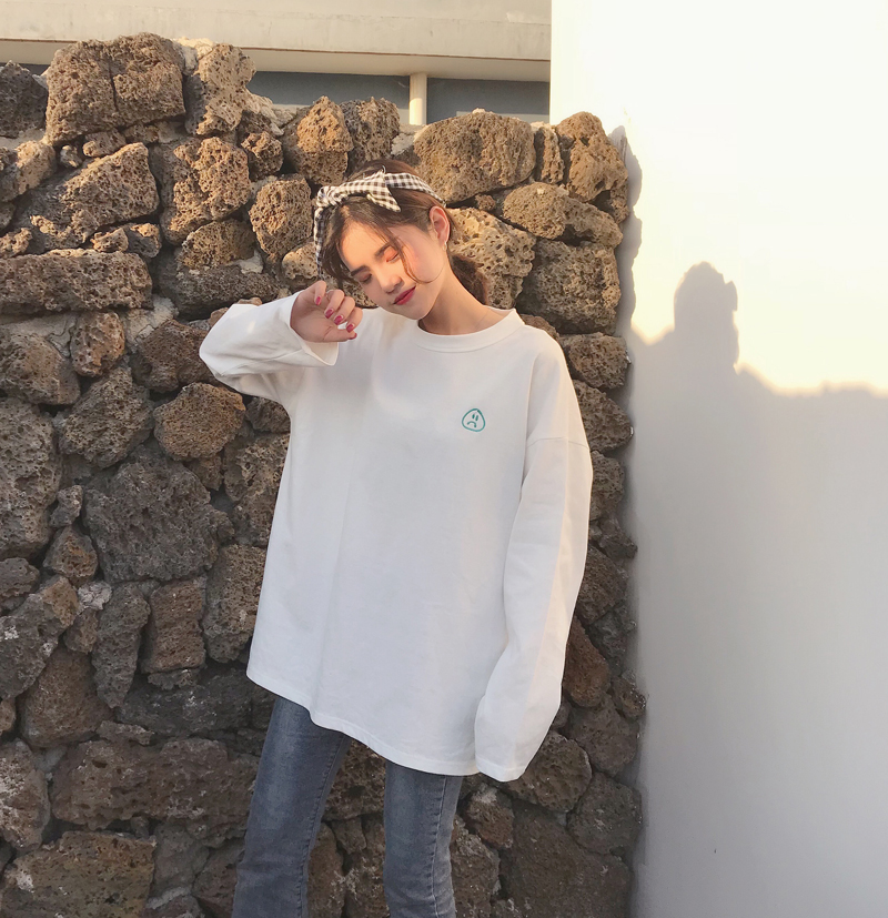 / 秋裝女裝韓版基礎款寬松簡約百搭笑臉刺繡長袖套頭T恤打底衫上衣