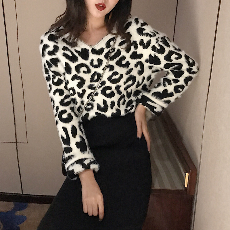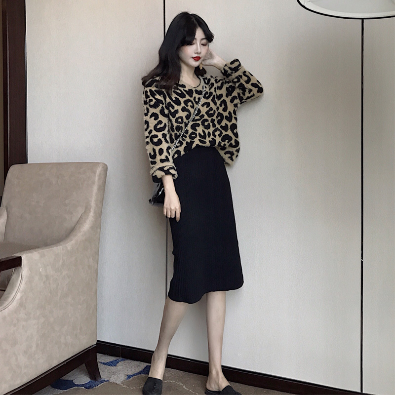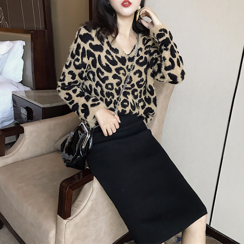 / 港味慵懶風毛衣女V領寬松豹紋長袖針織半身裙兩件套時尚氣質套裝