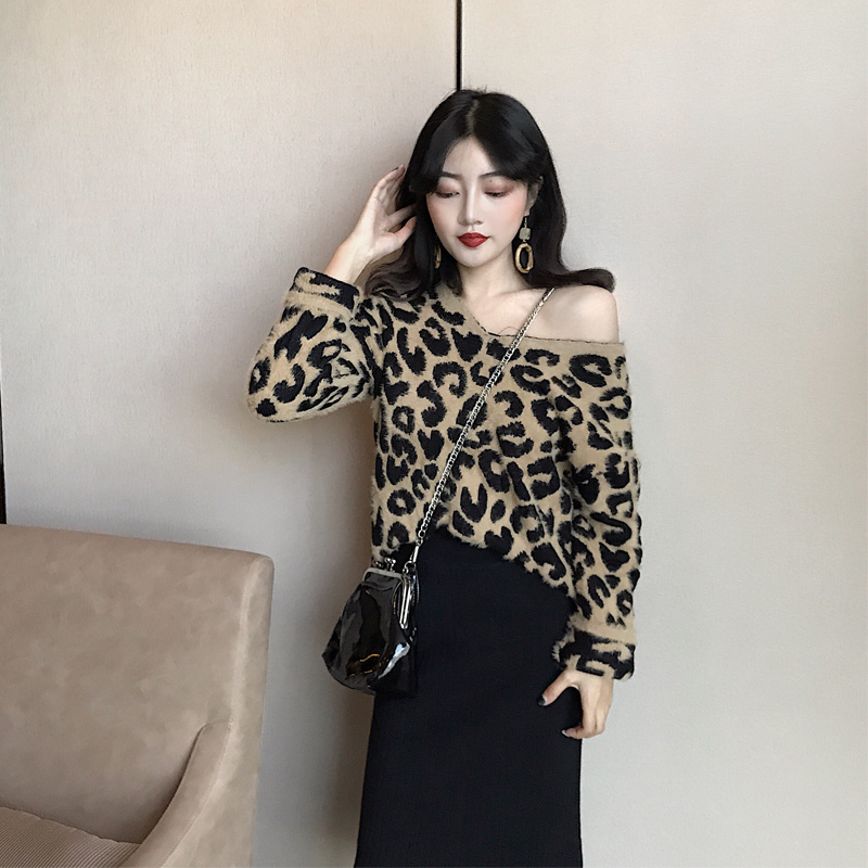 港味慵懶風毛衣女V領寬松豹紋長袖針織半身裙兩件套時尚氣質套裝