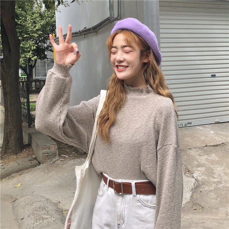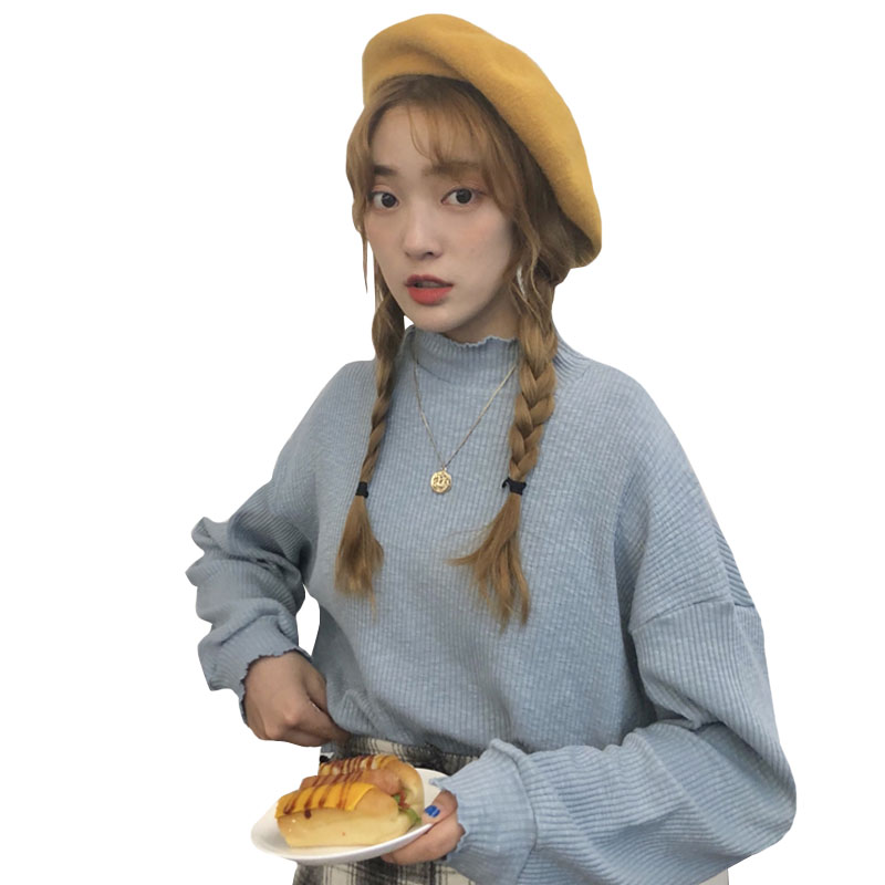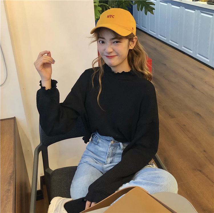 秋季女裝2018新款韓版寬松半高領木耳邊慵懶風長袖套頭針織衫上衣