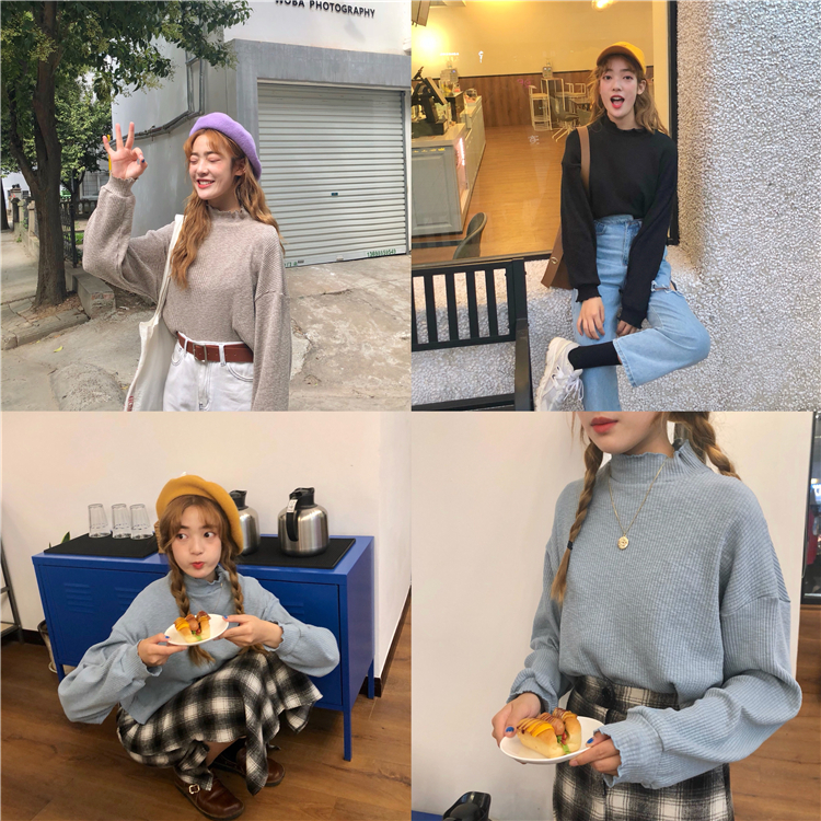 / 秋季女裝2018新款韓版寬松半高領木耳邊慵懶風長袖套頭針織衫上衣