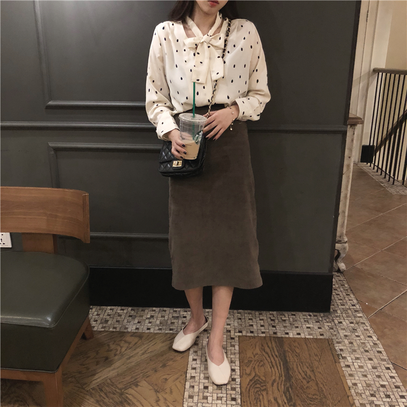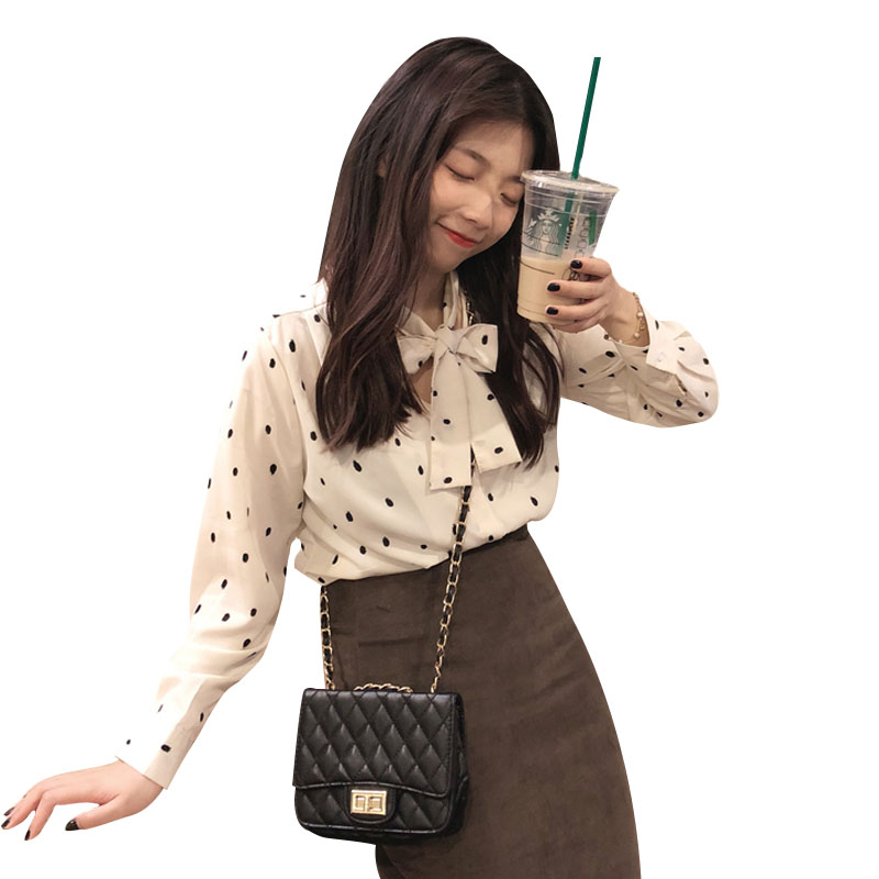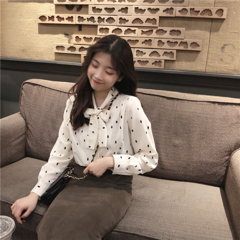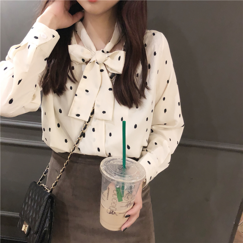/ 秋季女裝韓版chic氣質復古不規則波點系帶休閑雪紡衫長袖襯衫上衣
