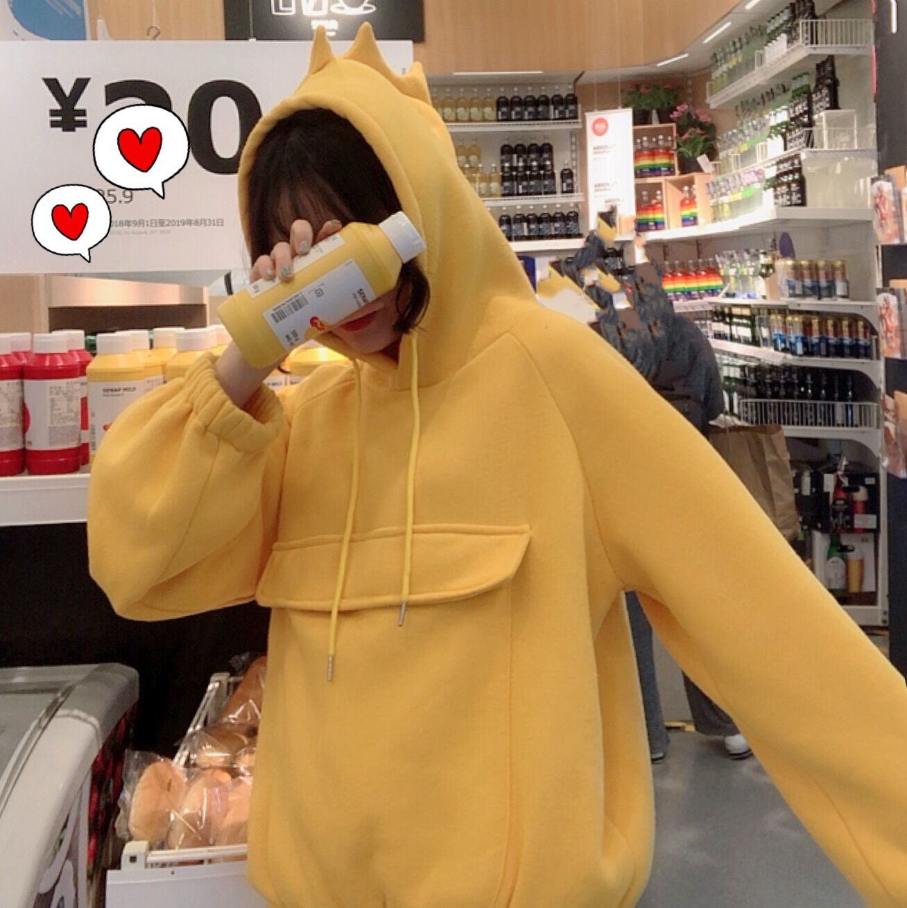 / 秋冬女裝韓版純色寬松加絨加厚可愛恐龍連帽套頭超火衛衣上衣外套