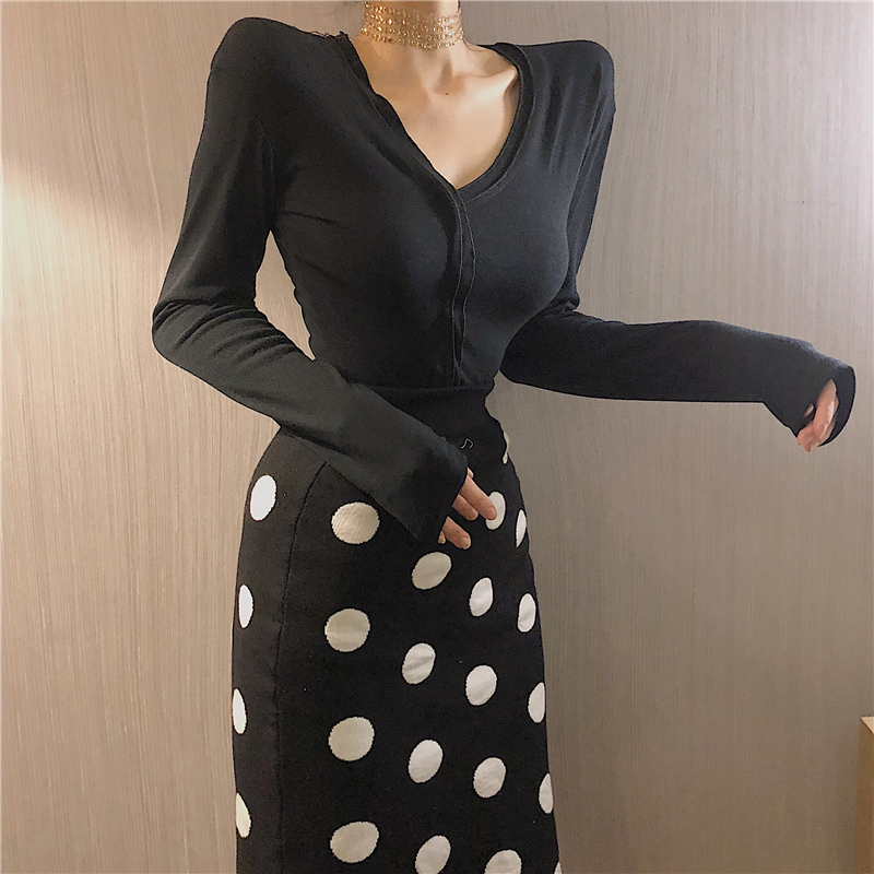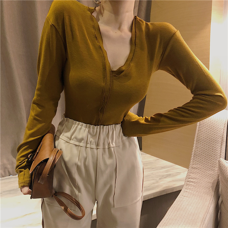 / 秋冬女裝新款chic簡約百搭V領小性感緊身長袖T恤修身內搭打底衫潮
