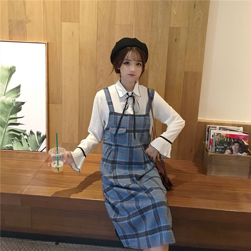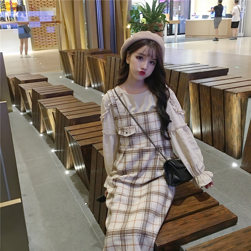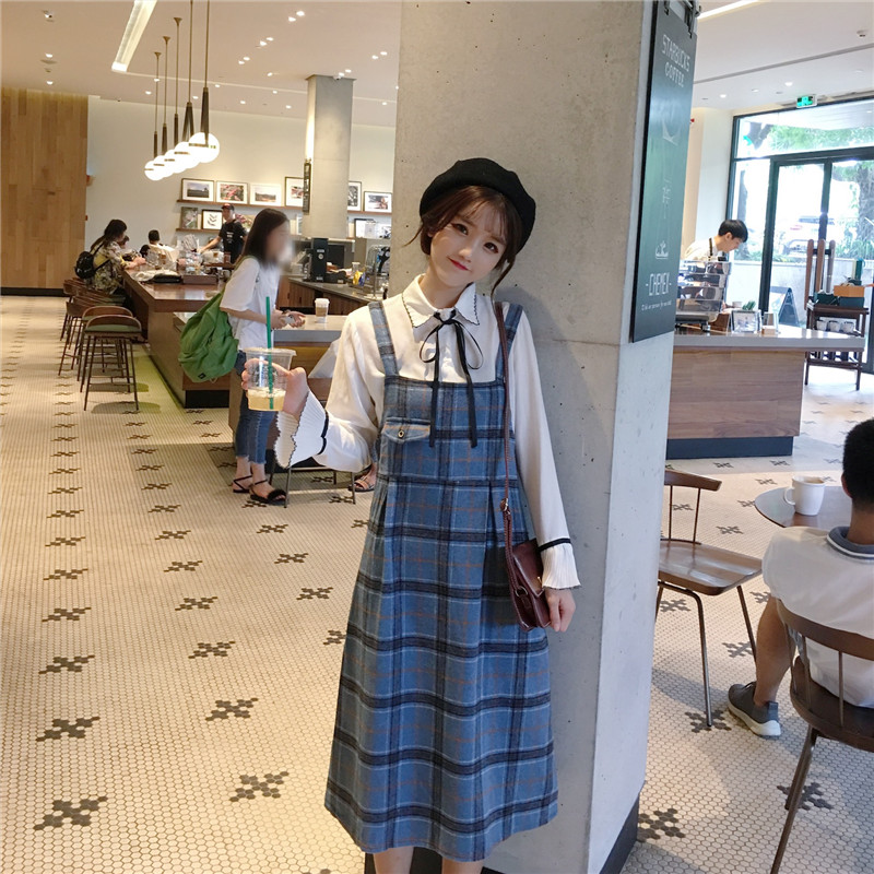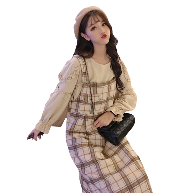 / 秋季女裝韓版中長款復古A字裙背帶裙寬松毛呢格子無袖連衣裙長裙