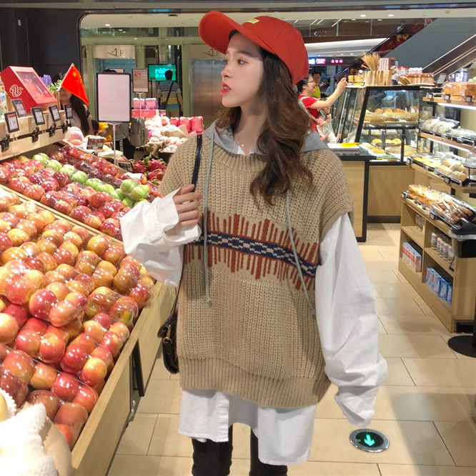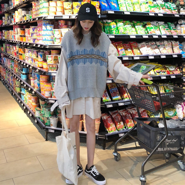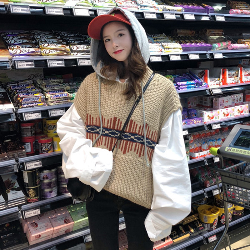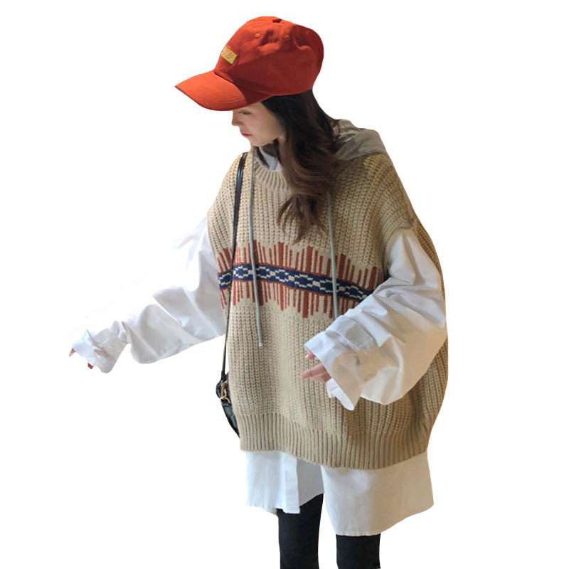 / 韓版時尚休閑套裝秋季撞色連帽中長款襯衫+毛衣馬甲外套兩件套女