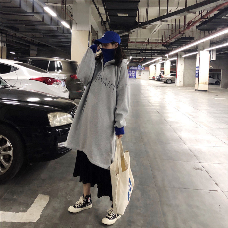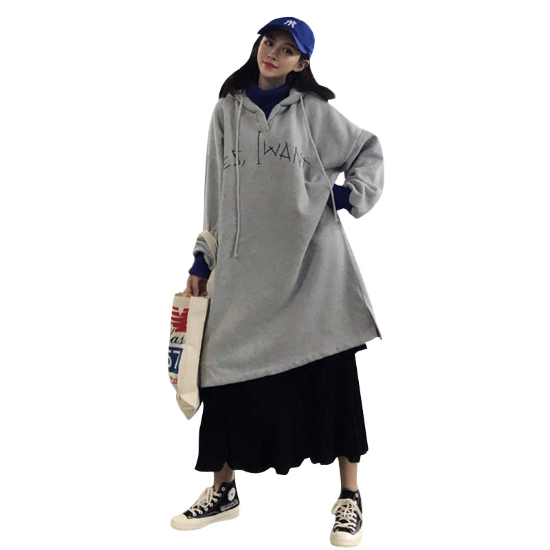 / 秋冬女裝韓版中長款過膝字母刺繡連帽BF風寬松套頭超火衛衣裙外套
