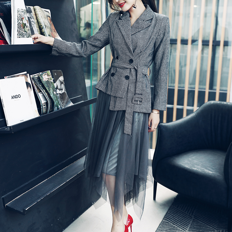 / 名媛氣質2018秋新款收腰小西裝休閑外套百搭不規則網紗半身裙套裝
