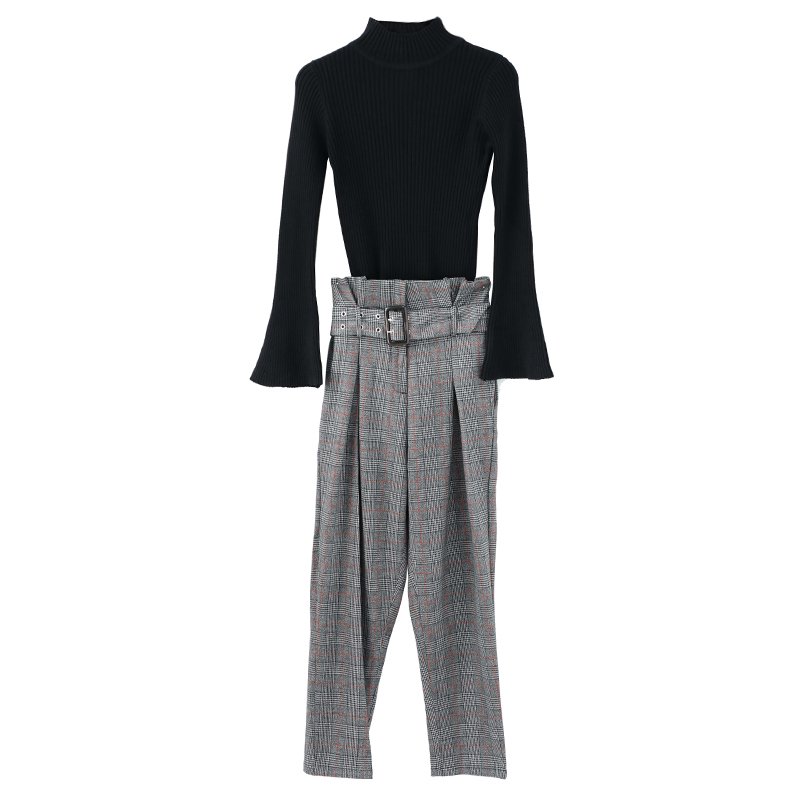 洋氣名媛氣質套裝女裝秋裝2018新款針織上衣格子高腰褲子時尚兩件