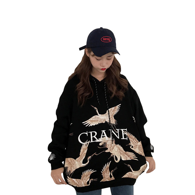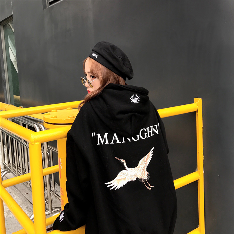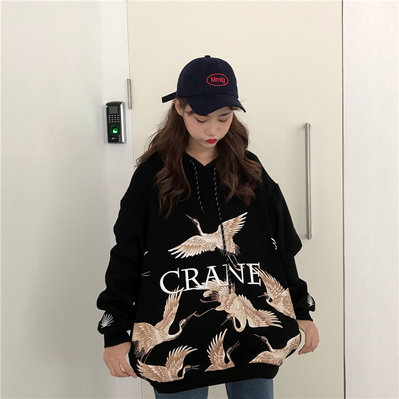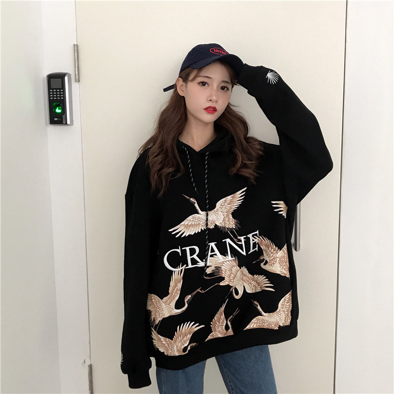 / 秋冬女裝韓版中長款原宿風個性仙鶴寬松連帽套頭超火衛衣上衣外套