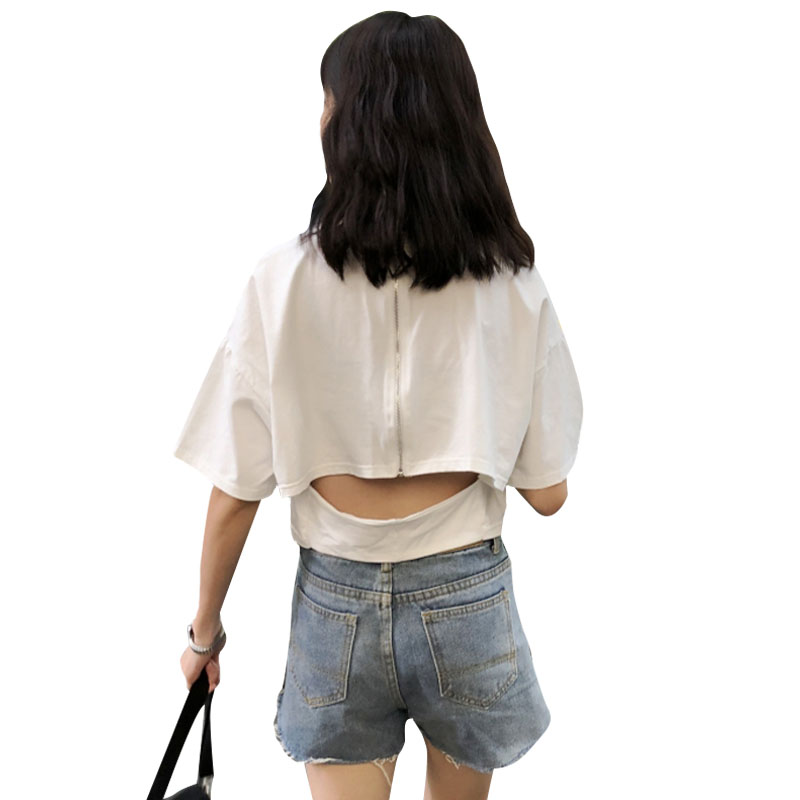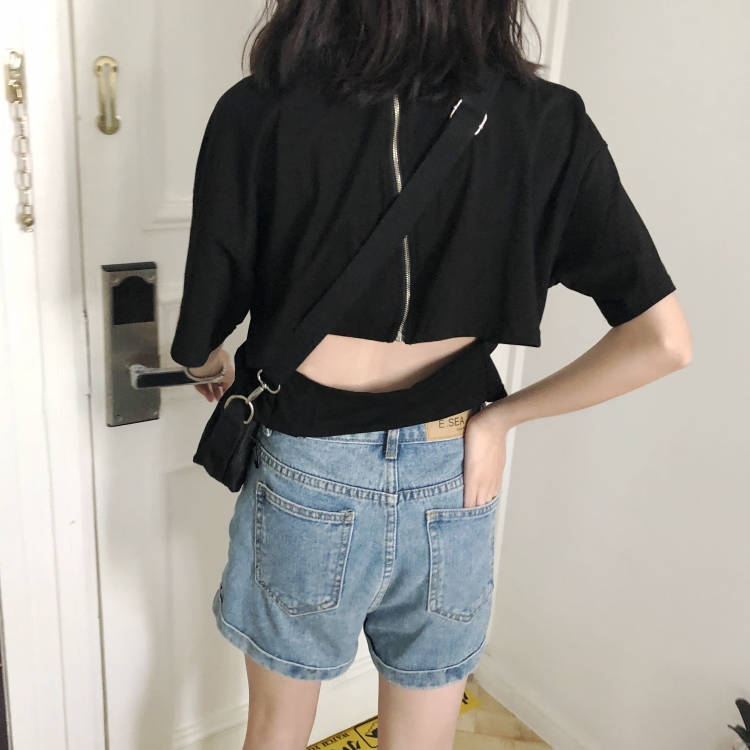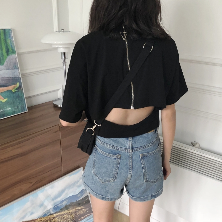 / 夏裝女裝新款韓版純色露背短款T恤寬松個性拉鏈短袖顯瘦上衣學生
