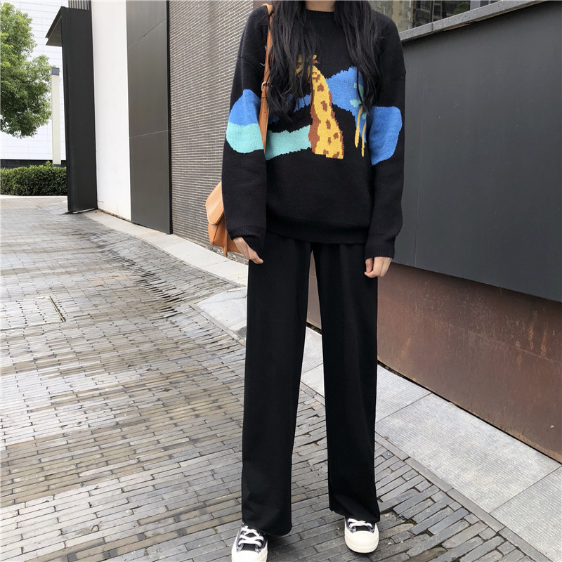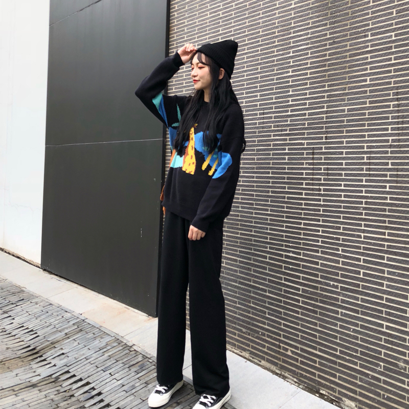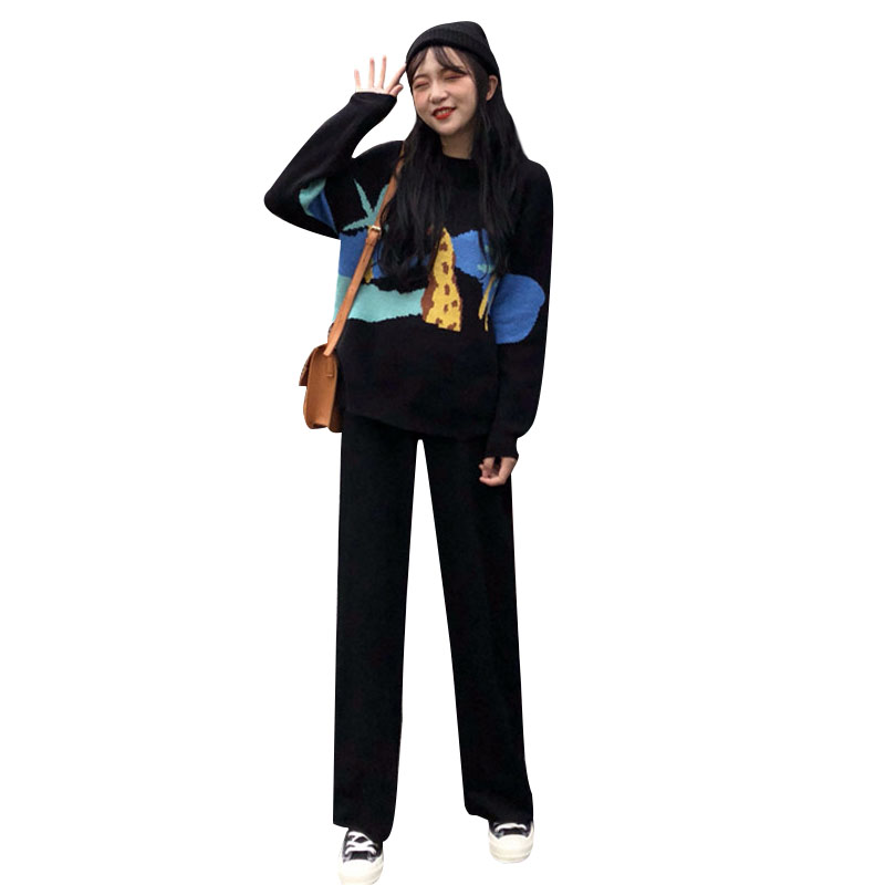 / 韓版時尚休閑套裝秋季長袖卡通針織衫毛衣+半身裙+闊腿褲三件套女