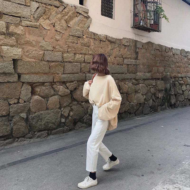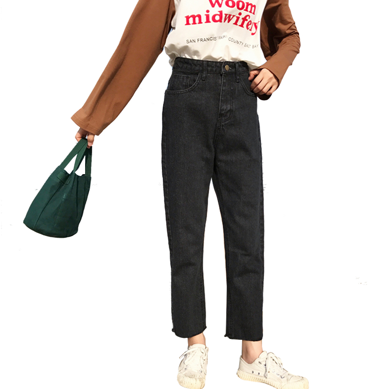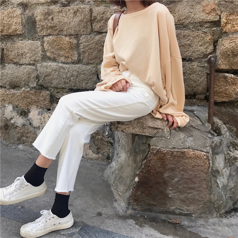 / 秋裝女裝韓版簡約百搭寬松直筒褲白色牛仔褲九分褲高腰闊腿褲長褲