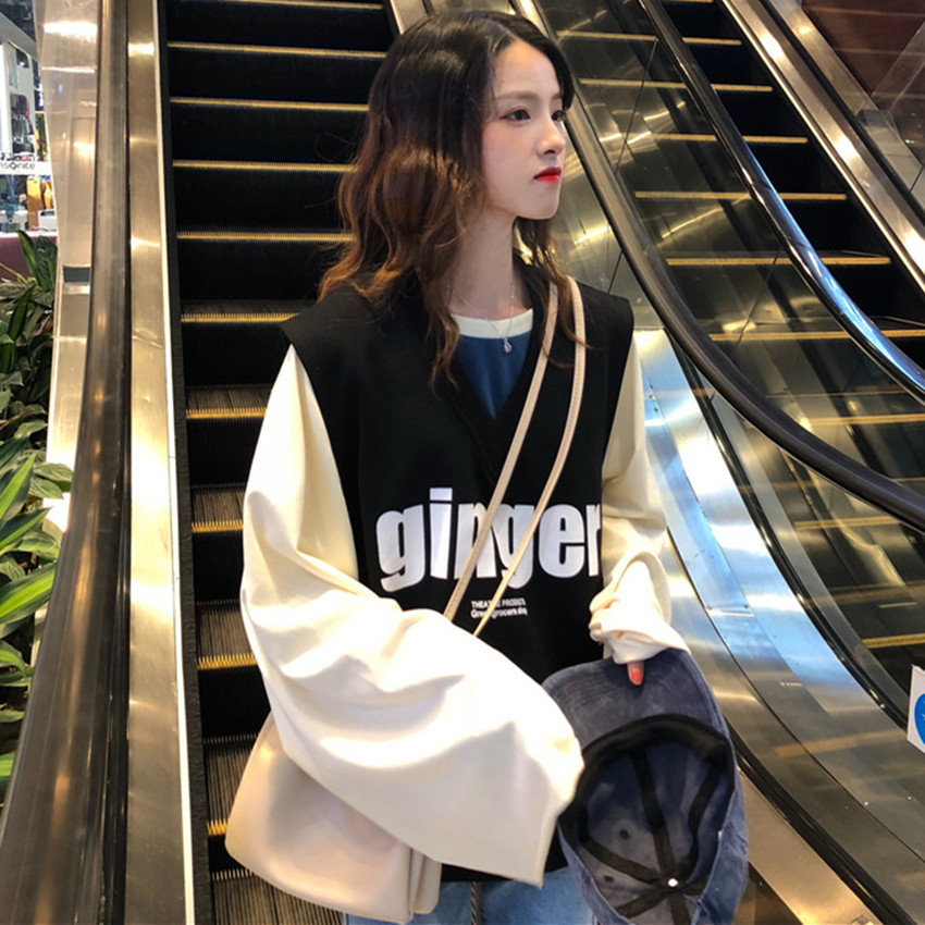 / 秋季女裝韓版學院風寬松字母印花V領套頭背心無袖馬甲上衣外套潮