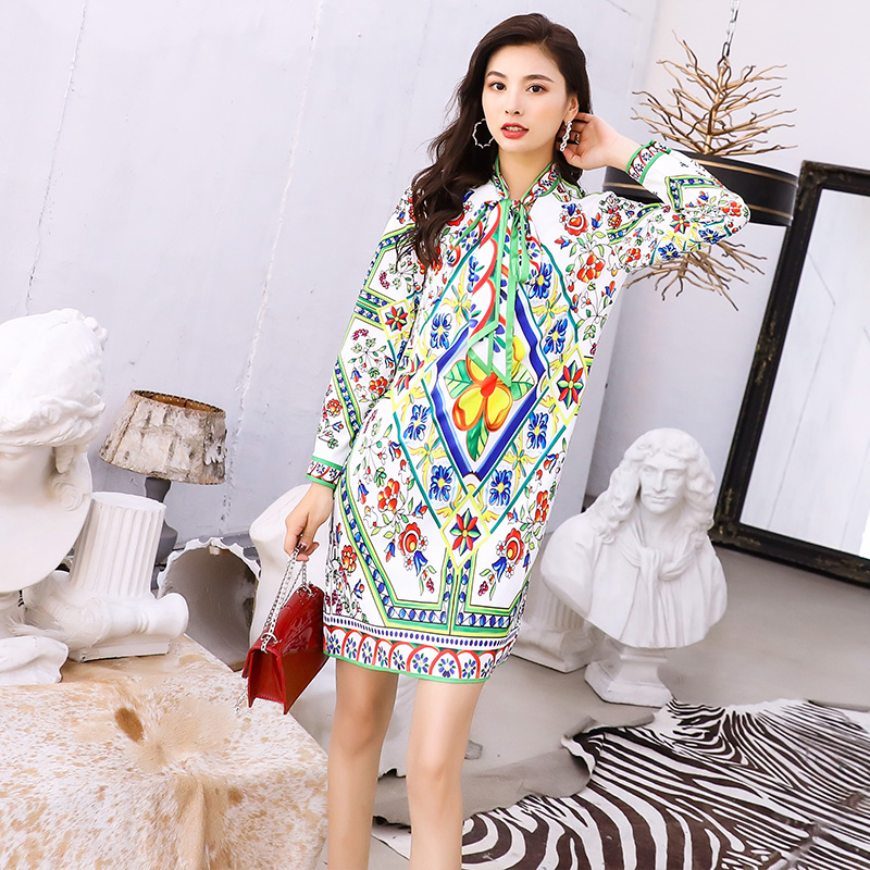 連衣裙秋裝2018秋新款印花女裝名媛氣質女神范中長款收腰顯瘦裙子