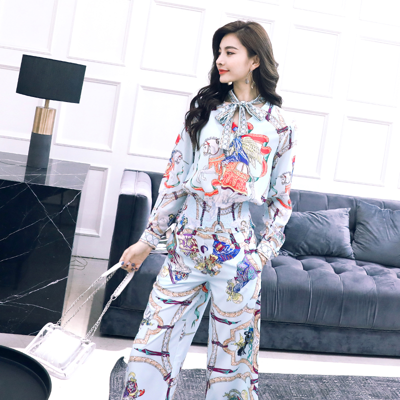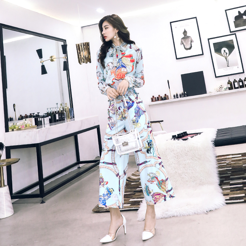 / 2018歐洲站時尚氣質修身印花洋氣收腰上衣九分闊腿褲套裝兩件套潮