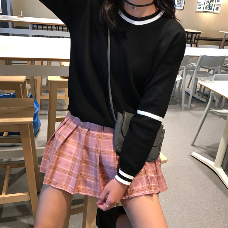 韓國學院風秋冬款撞色圓領線條寬松套頭長袖打底衫針織衫女