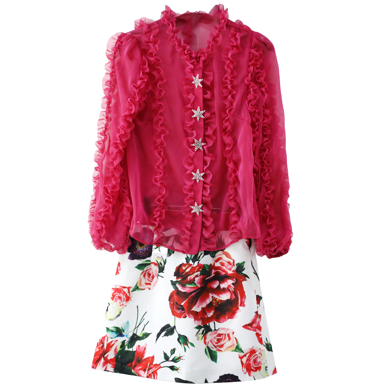 名媛套裝裙女2018秋裝新款時尚襯衫網紅心機高腰印花半身裙兩件套