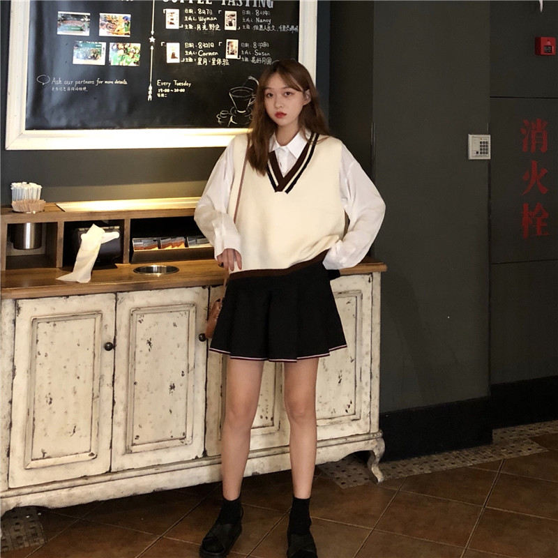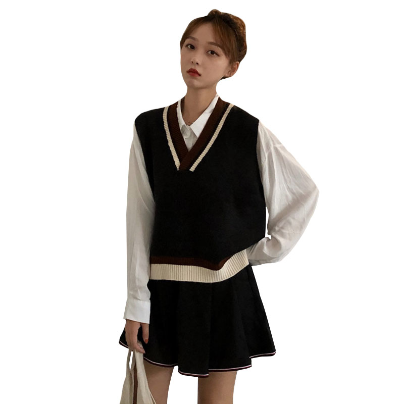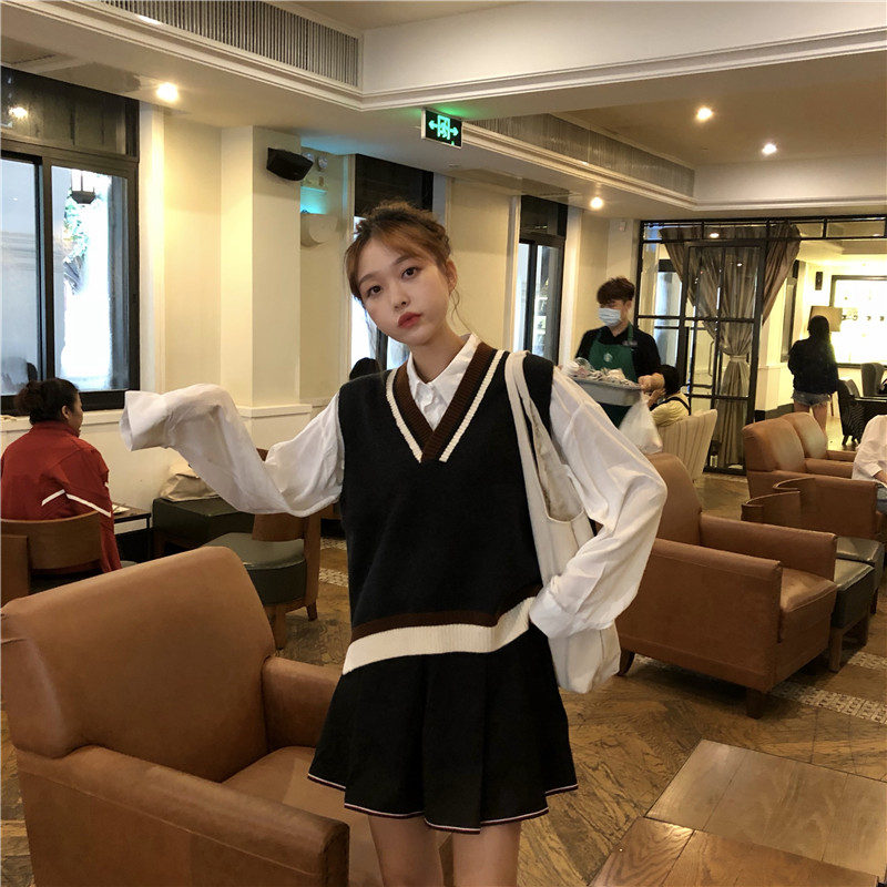 / 韓版時尚休閑套裝秋季女裝v領無袖針織馬甲+襯衣+高腰褲裙三件套