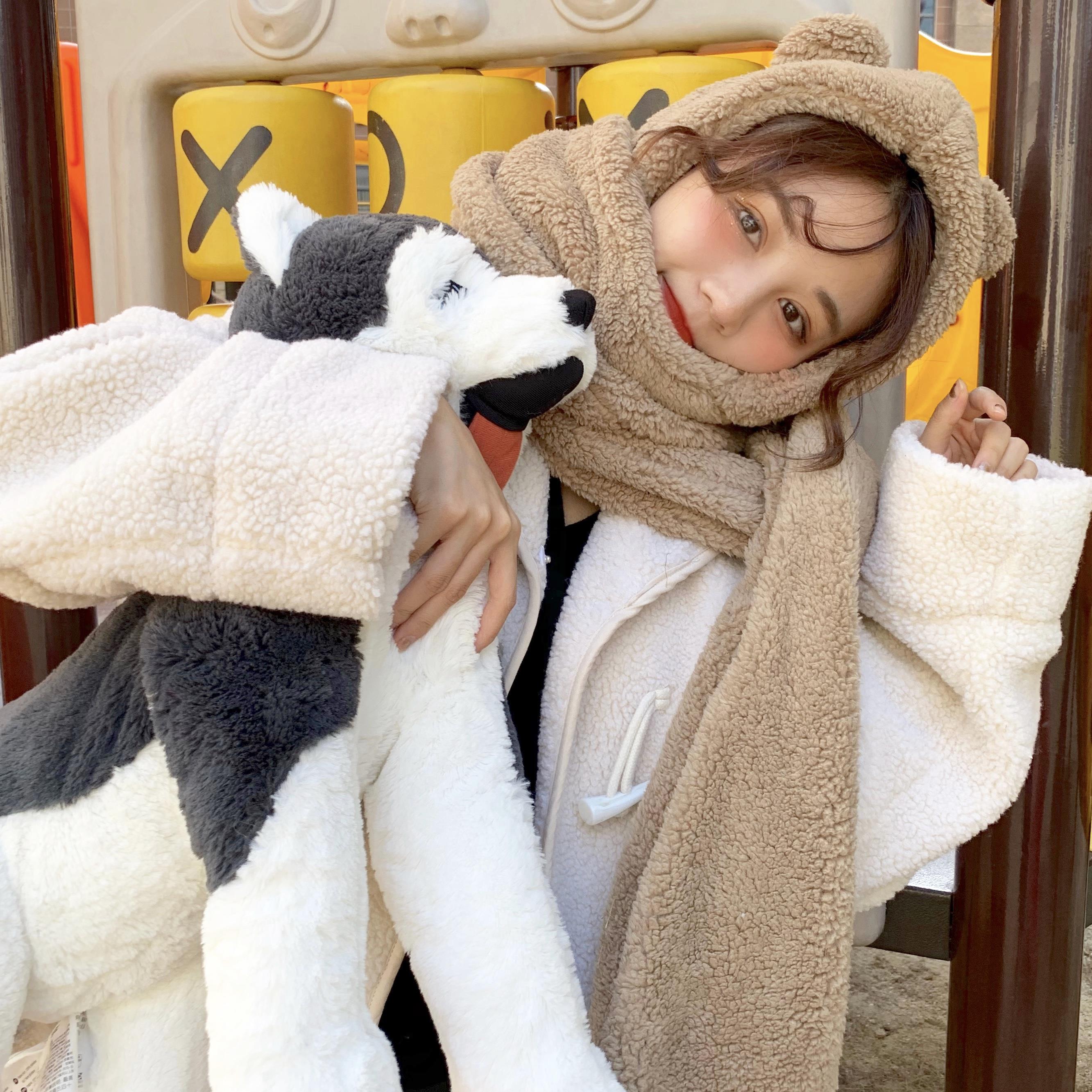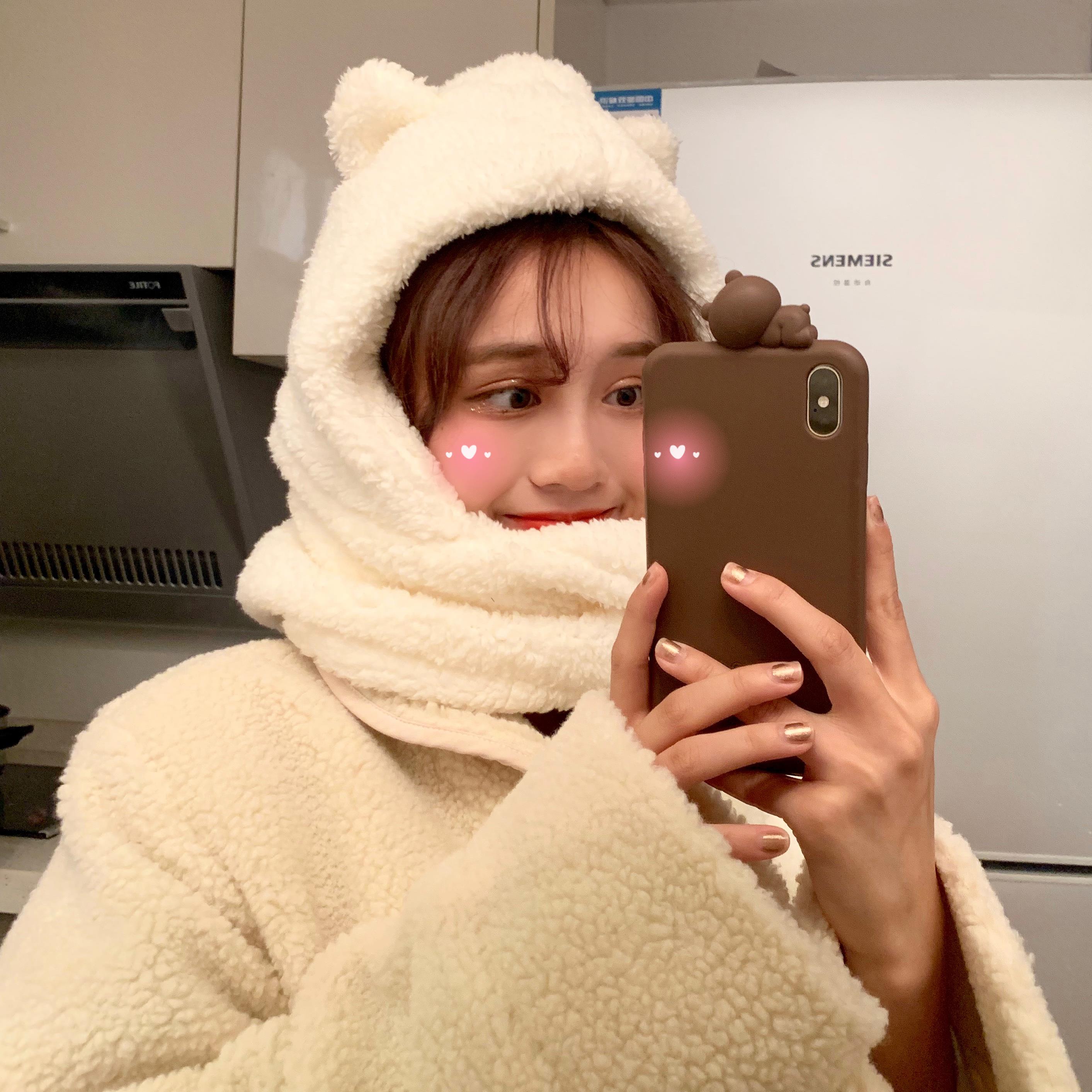 / 冬季韓版仿羊羔毛加厚可愛小熊耳朵保暖圍巾帽子情侶款連帽圍脖女