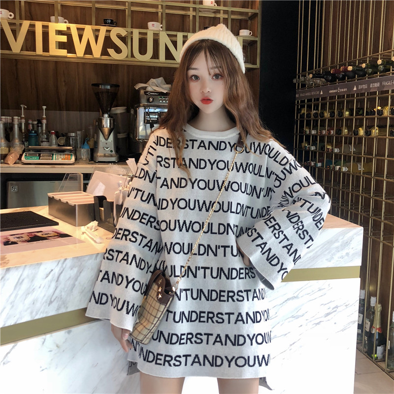 / 秋季女裝韓版中長款原宿風字母針織衫慵懶風寬松網紅套頭毛衣外套